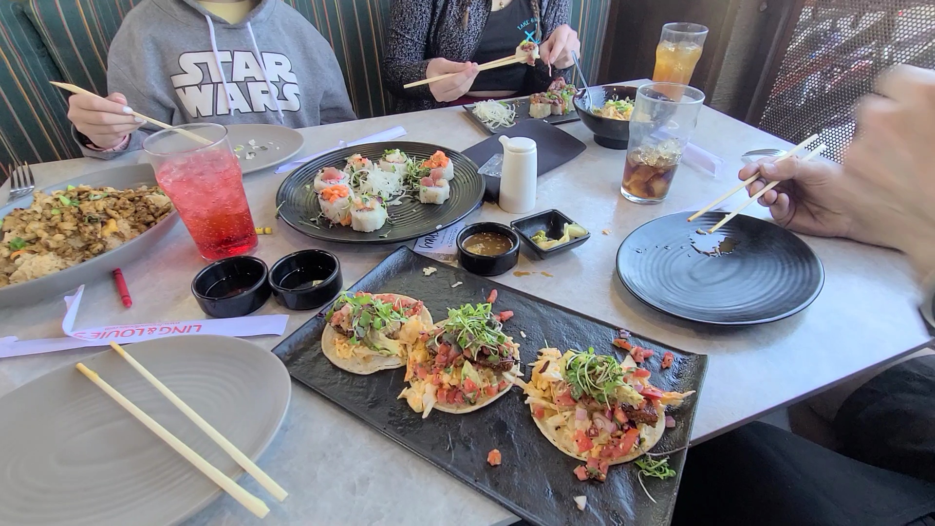 Let's talk about the food first. It was just OK. Not at the same level as other times we have been here. We always have the Calamari and it was just OK. It was a bit overcooked and the portion seemed smaller and breading seemed heavier than all our prior visits. The Combo fried rice was also disappointing, and we order this every time we are here. It was more like white rice that they put soy sauce on last minute and topped with a little bit of meat. There was not one egg. Scant, and I mean SCANT, slivers of carrots and a few green onion pieces. It was salty but otherwise flavorless. We ordered the Spicy chicken, and there was minimal spice and it was ordered with fried rice but we received white rice instead. We tried the chicken and rice soup for the first time and the flavors was good, we liked it but it was cool temperature wise, I like my soup served hot. Also we felt it needed more rice. We also had The Baller, another item we Always order. It was ordered as my daughter's entree for her 13 th Birthday Dinner. We came on her birthday, her choice because of the calamari and this sushi roll. It was served almost 5 minutes after our other hot entrees from the kitchen. This made no sense, since we had appetizers, so there was plenty of time to make it.