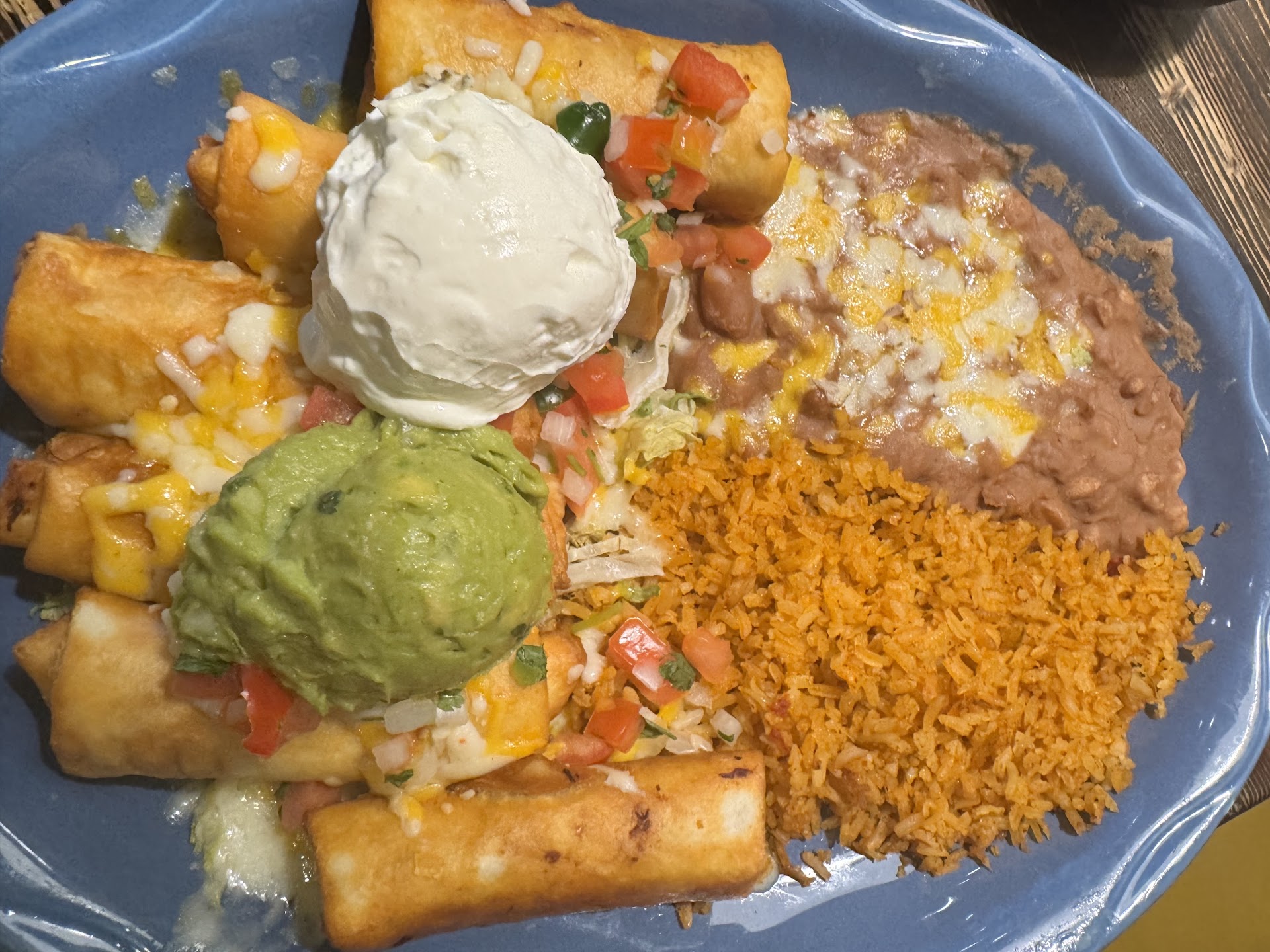 Then we were seated, told they've been out of green corn tamale bites for a few days (that's on the manager). Our waitress was the bartender, who did her best, but just had too much volume. We ordered 3 chimichangas, they all came out cooked completely differently, and the waitress never stopped by the rest of the meal. We were all out of water long before we were done eating. Food took about 25 minutes to come out.