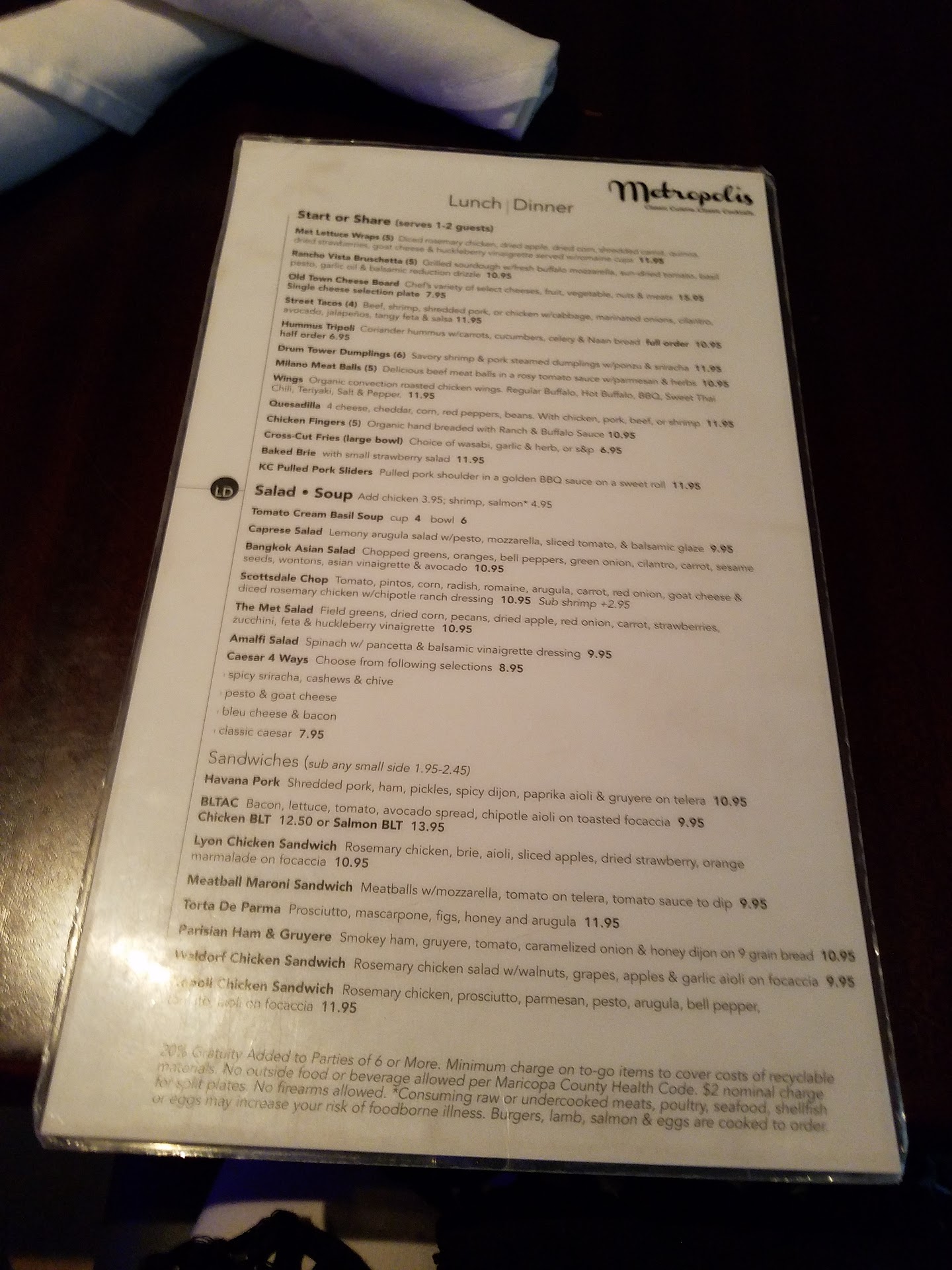 Read moreI found it by accident and it was a fortunate one! Located in a newer metro living complex we had to drive around it a couple of times. Parking was easy and after a short walk under a well-shaded area we found Metropolis. Small place with a good looking bar and an awesome menu. It has a very eclectic menu which gave us many options to please us. I had the honey ginger shrimp platter with Asian slaw. I liked it but found it too sweet. Shrimps were enormous. Ron had mac'n cheese with meatballs. I tasted his mac and preferred it to my dish. Our friend had the pork bowl and devoured the whole thing! We also shared a caprese salad. I liked it but l was again overwhelmed by its sweetness as it was covered with a balsamic glaze. I still give it a five star for their creativity, diversity and service and l will return to try...