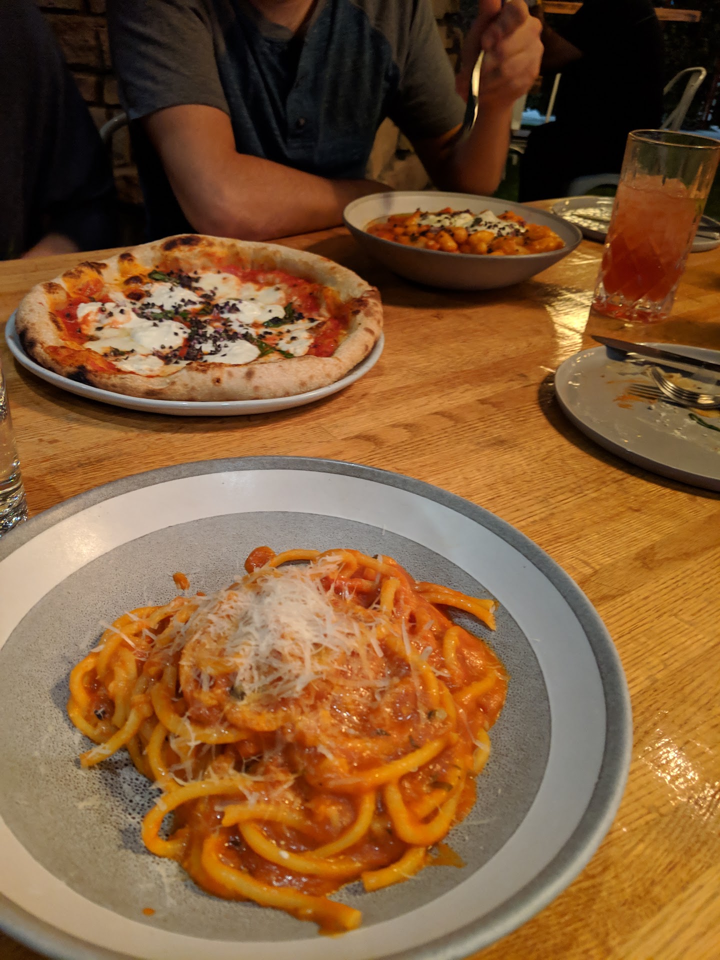 Ā Ā Ā Read moreIt's my birthday and I wanted Italian. This place looked good, and the menu had some decent offerings. We made a reservation for an indoor table. We told the hostess that we had a reservation and she didn't even look. She just said "indoor or outdoor?" She would have known if she would have looked. The decor is cute enough- some blue fabric chairs, some ikea lighting, a wall of mirrors.. nice. The food was delivered REALLY quick. Like- too quick. Our appetizers were delivered about 30 seconds after ordering. The rest of the food came out maybe 2 minutes later. We got the burratta bruschetta starter. Not impressed. It was just some really runny messy cheese on toast with a small slice of tomato and a basil leaf. It was sour tasting. The menu said it had "honey balsamic", but there was no sweetness. I've ordered bruschetta at a lot of restaurantsand this was on the lower end of the spectrum. It was pretty, but that's about it. I got the papperdelle bolognese entree. The sauce tasted fine- but nothing exciting. The noodles were far too al dente- actually really chewy. There were constantly hard chunks getting caught in my teeth. Not fun. The restaurant was filled with screaming children since they serve pizza - and their moms were guzzling wine. I didn't expect this place to have so many tables of kids. Halfway through dinner the sun came raging through the windows- even though they had tint- and I couldn't see a thing for the rest of the meal. For two entrees, two diet sodas and one appetizer- it was a hundred dollars with tip. It was just an overall unimpressive experience... I'm not going to...