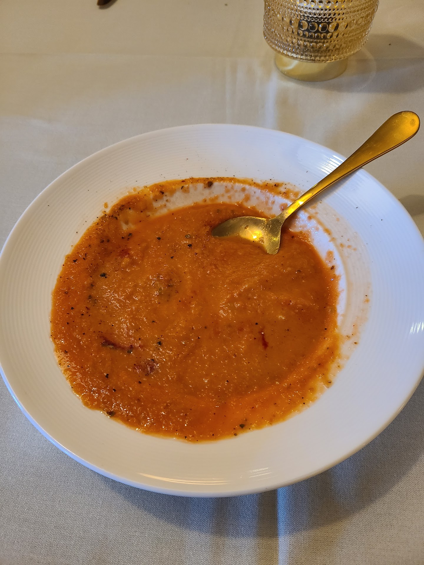 Our meat was delicious, the mashed potatoes were fantastic, but the Gazpacho, goodness. I felt as though I was in Spain, watching the birds fly overhead as each spoonful touched my lips. It was delicious.
