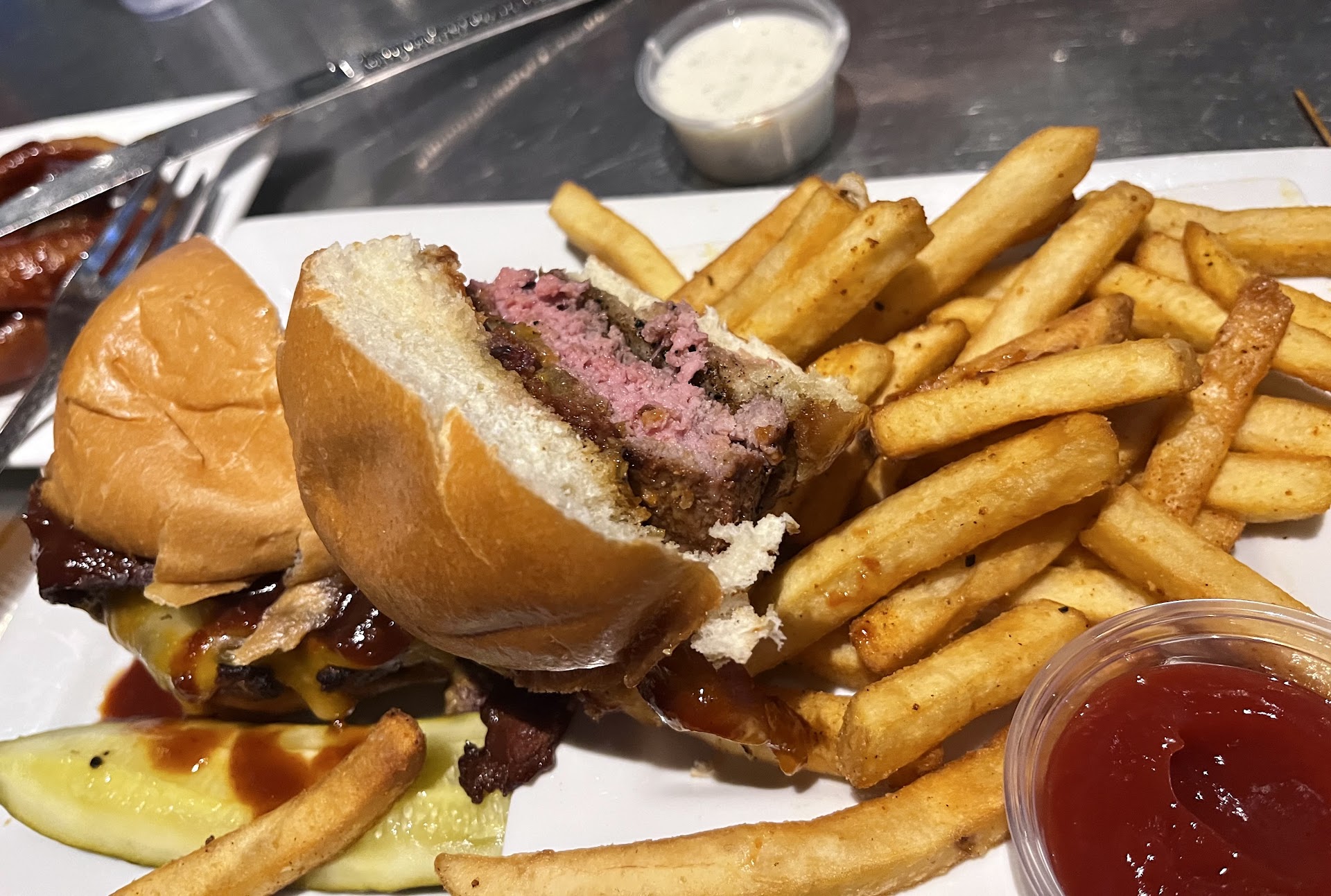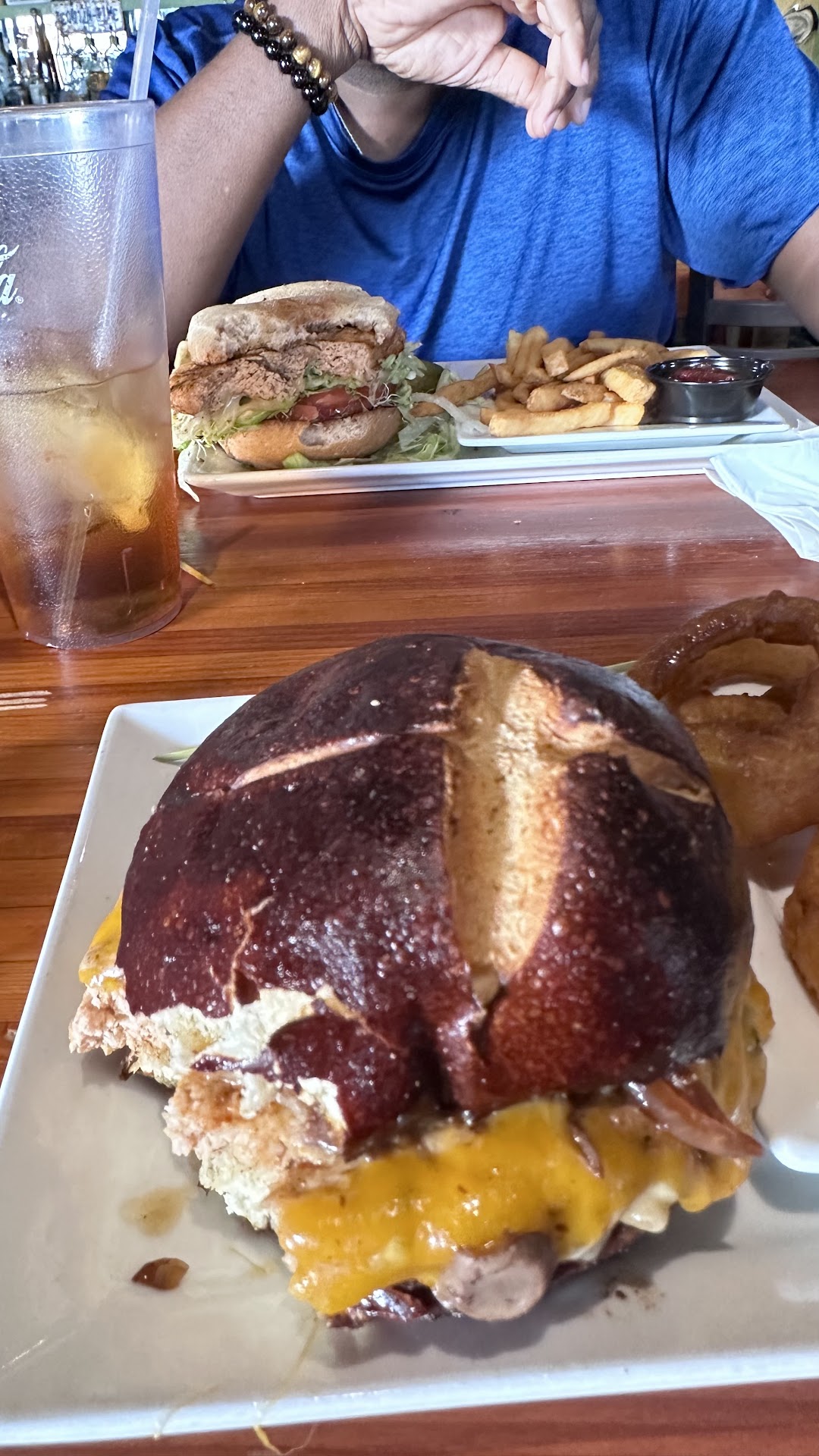 First Visit I got the 10oz Backyard BBQ Burger medium and added bacon. Temp was accurate. FF were crisp and delicious. I didn’t love the very thick Brioche Bun (too much) and the Onion Rings on top made it just too challenging to eat, so I took them off and ate separately. The abundance of spicy pineapple BBQ Sauce had good flavor, but made for quite a messy meal(see photos). My friend got the BYOB (build your own—5oz basic cheeseburger) and opted for the Sweet Potato Tots instead of FF. I didn’t love those—too sweet and not crisp. Choice of Brioche, Pretzel, Wheat, or GF Bun. Sub grilled Chicken, Veggie Patty, or other for the beef. Happy Hour daily 11am-6pm and until closing on Thursday. The decor is reminiscent of a beach front restaurant! It’s got a small outside patio. Inside vibe is ok…kinda dark, especially for lunchtime. Small, tight dining room that’s right up against the small bar with seats. But it seems to work. It was pretty busy at lunch for a Monday. Service was fast, friendly, accommodating ,and helpful. Parking is behind the restaurant. After two poor visits and unfriendly management, I can’t...