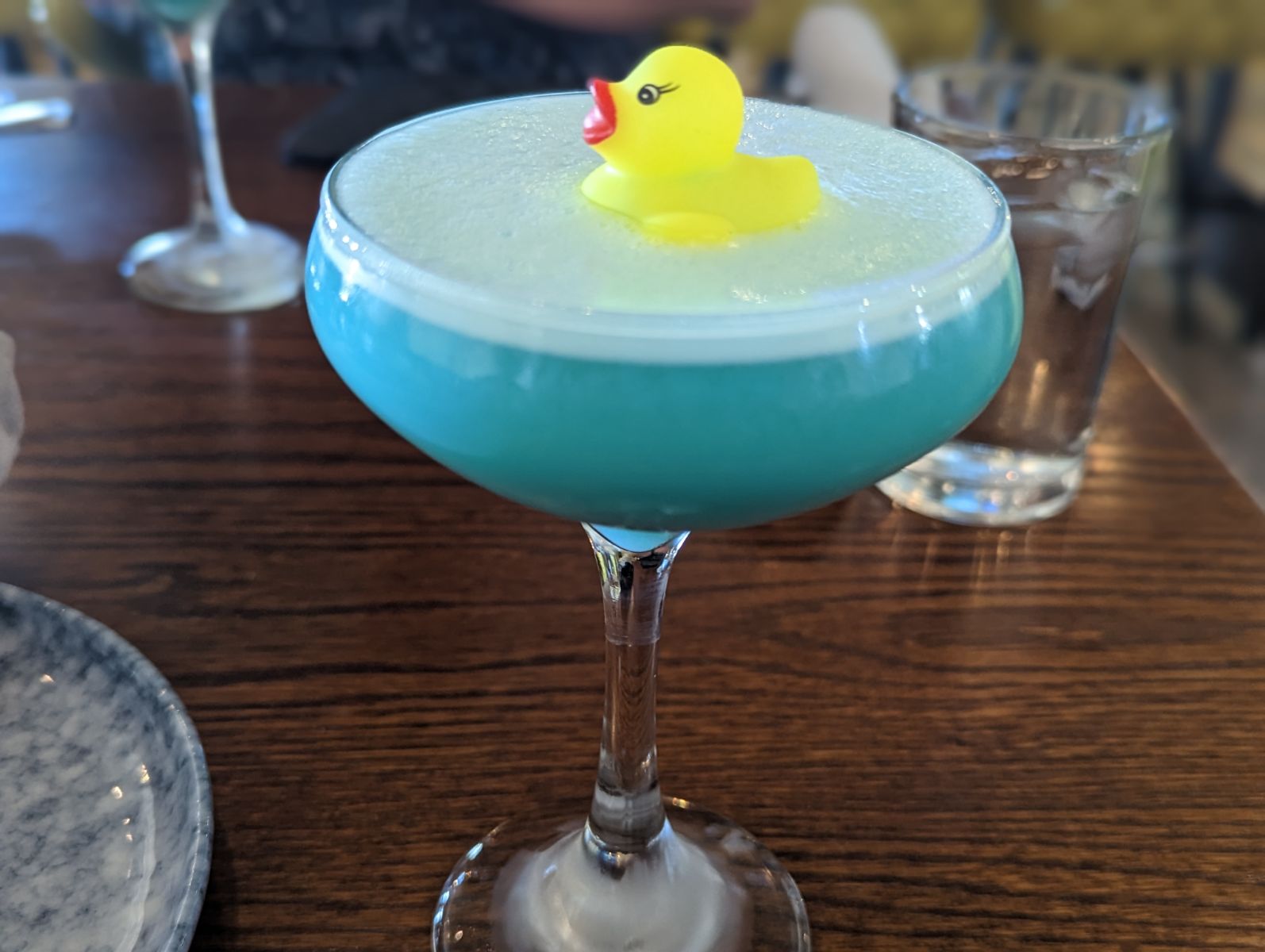 The service was very good. While it was pretty empty when we came in, it was PACKED within an hour or two throughout the restaurant. This is clearly a hopping place (though I didn't see any rubber ducks at other tables, so the conclusion I drew was that they have other scrumptious items on the menu). Our waitress was great. Not only did she nobly advocate for my off-menu request, but she was absolutely slammed for most of our visit and still kept her head above water (honestly a phrase I'm not sure I say if I'm not thinking about the ducks). Super friendly and kept the blue beauties coming.