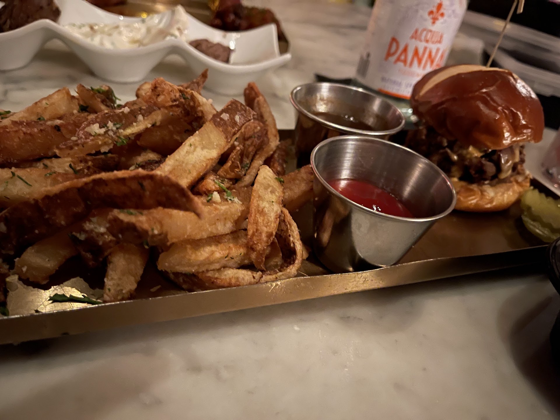 So to make sure I gave an honest in-depth second review I got a few dishes to try out and man do they have some tasty food. The team in the kitchen is killing it. The wings were crisp all the way around and mixing their Buffalo and BBQ sauce on the wings was perfection. If I’m not mistaken I believe even their ranch was made in house and even that tasted delicious. Next, their sweet potato waffle fries had just the right amount of seasoning and tasted even better when mixed with their chipotle sauce. The French sliders were juicy and the sauce to dip the sliders in put them up on another level. The filet bites were cooked at perfect temperature, they were seasoned a bit lighter than the rest of the food but that was for a good reason. They came with a cream you dip them in that just added so much flavor. We then move on to the COD tacos, although not my favorite thing I ordered that night I can honestly say you would not be disappointed. The tacos tasted good and the veggies were nice and fresh. Loved the beans that came them but I would die for a whole bottle of the salsa it was paired with. The Patty Melt had flavor in every bite, I’m not huge on burgers but I wouldn’t mind eating these often. Of course the food was finished up with their tasty chocolate chip cheesecake.