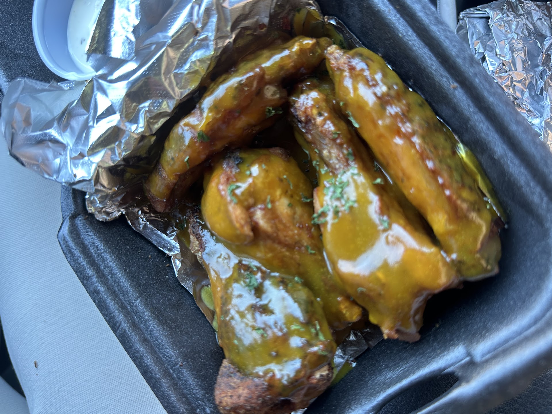 Read moreI knowwww these pictures look like some fire a*s wings. Unfortunately they did NOT live up to the hype. I'm actually really confused, maybe we got them on a bad day? My husband stopped in on Friday after work to grab us some wings, as soon as they came out we sat in the car opened they up and excited to try them but the mustard smell from the first pic was over powering, the lemon pepper and teriyaki were VERY mediocre. The lemon pepper season really didn't have any flavor until your last few chews more like an after taste. The teriyaki wings had a very odd taste it wasn't like it was a teriyaki. I understand everywhere teriyaki is different but this was like it was sour. Long story cut short we didn't even finish them. We tried taking it home to spicy it up throw some more seasoning or something on. But that didn't work. Unfortunately it was definitely a...