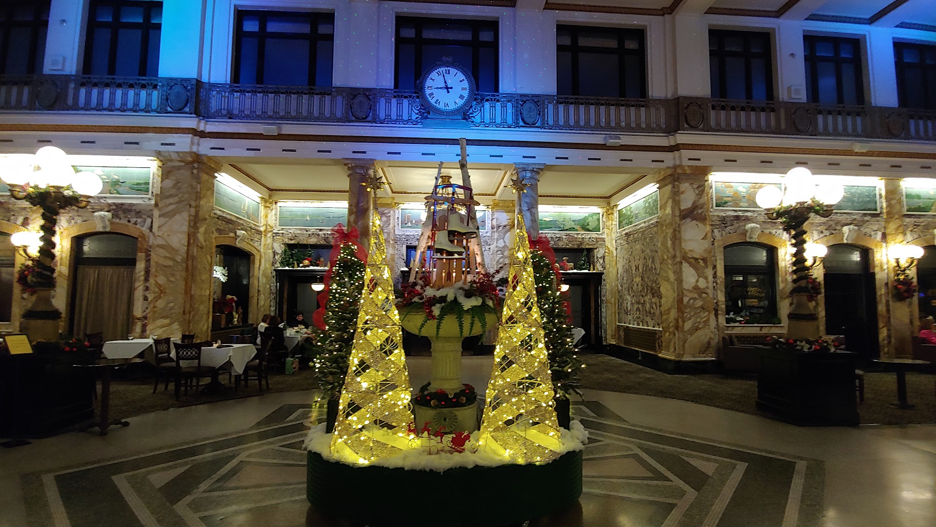 While the old train station is still beautiful it is in need of some repairs. The antique style Santa Clause that is in front of the building looks like he can use a power washing. From my seat I could see poorly run wires and plaster patches on the walls. While the building was decorated for Christmas there was no music to set the mood, live or recorded, which was a truly disappointing considering they have a baby grand piano.