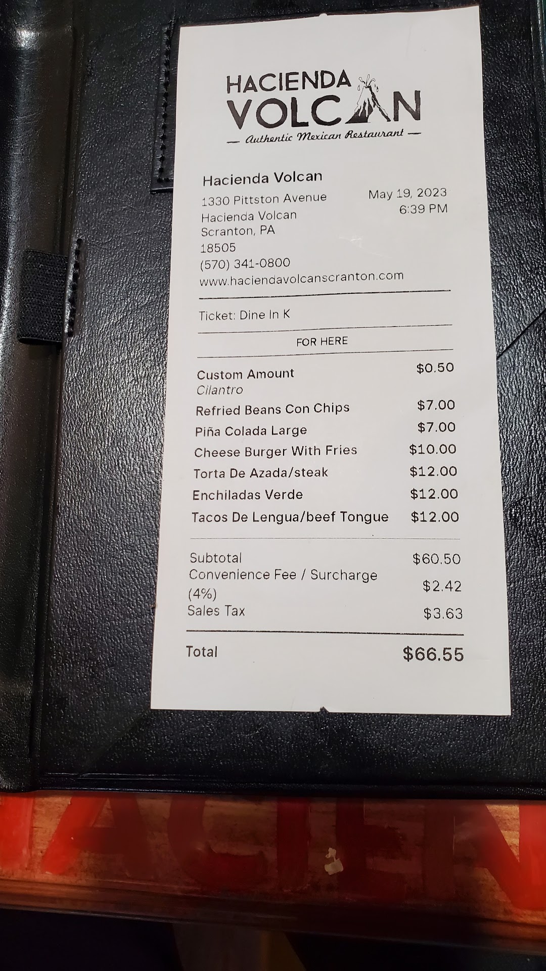 Read moreUpdate 5/19/23 - We understand prices needing to be increased with inflation. Which this restaurant has done (Tacos use to be $8, tonight $12, kids burger use to be $7.50 and now $10, Enchilada was $9 and tonight it was $11.50 on the menu but charged as $12, Steak Torta use to be $8 and is now on the menu as $11.50 but charged at $12). We do not appreciate just being charged extras on a bill without saying something. The recepit prices were $.50-$1.00 higher per item PLUS a service fee tacked on before tax which also makes the tax higher.