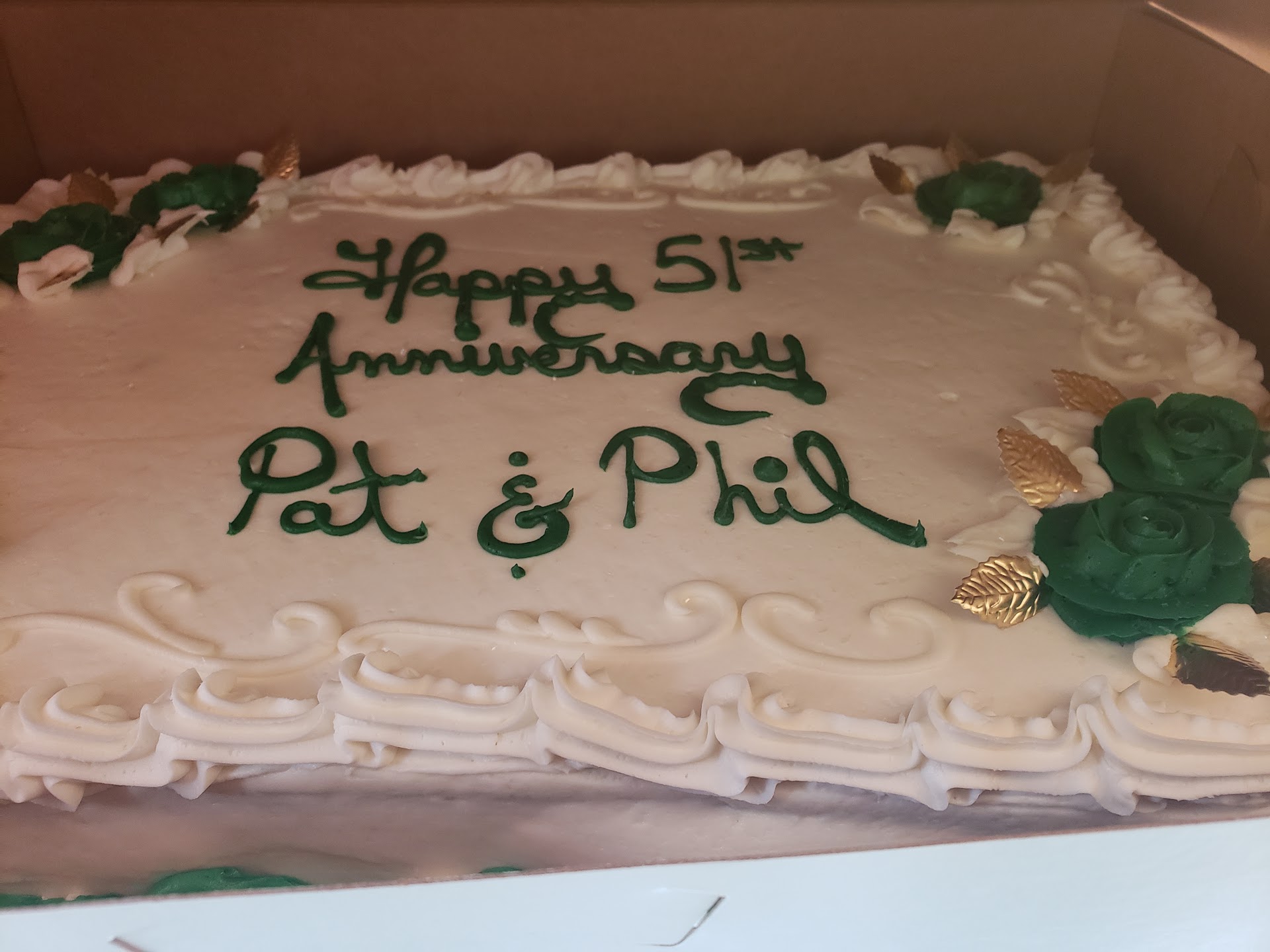 We ordered a cake for my in-laws 51st anniversary. I had them repeat to me what was to go on the cake, Happy 51st anniversary Pat and Phil. The cake they made said Happy 51st anniversary Ann, Pat, and Phil. Apparently they did not find it odd that people celebrating their 51st anniversary would have 3 people in the marriage. They did not bother to call and confirm what was to be written on the cake. They did fix it but you could tell it was fixed. I also asked for hunter green and gold decorations as that was their wedding colors. The person taking the order said that was no problem. We got pale green and somewhat darker green. Again no call to let us know they couldn't do what was ordered. We'll see if it is actually carrot cake with cream cheese icing when it is cut...but not holding my breath. Never again will I go to...
