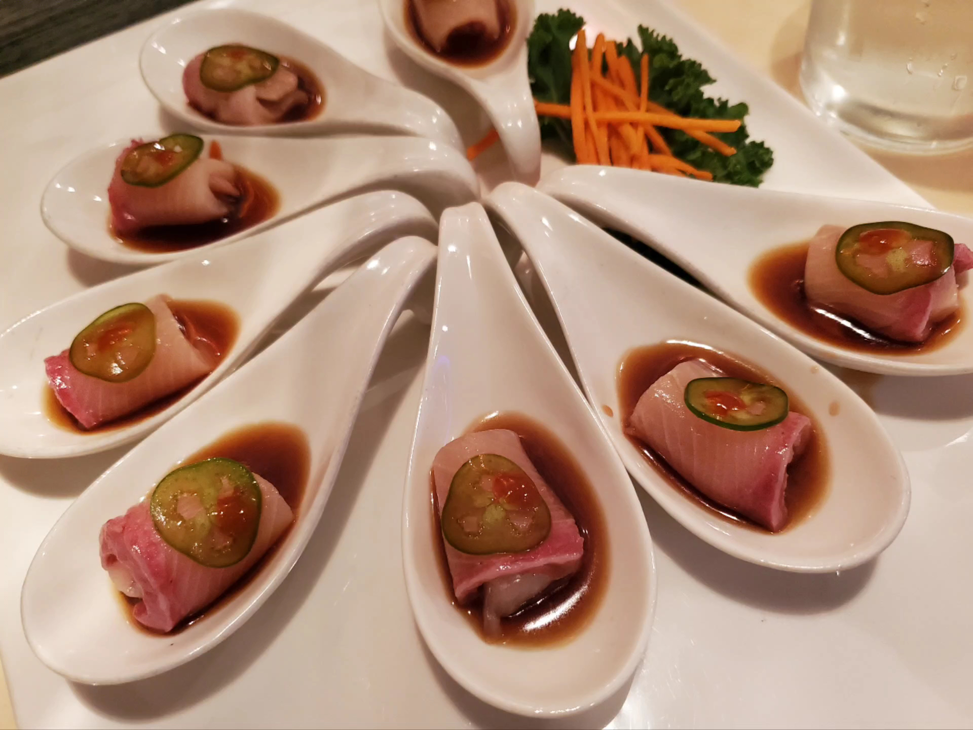 Boy! I am soooooo happy the ramen place we were going to dine at last night was closed! ( We love that spot too but totally different) Okay so my boyfriend agreed that the rainy drizzling day called for Japanese soup and Yume served us that and oh, so much yummies more. First off , the spot is to me super cool...right next to a mini nursery of sorts ..Yes , I planted(pun intended) groundwork for future plant buying. Muwahahahha. Second, the atmosphere is calming modern. Perfect for soup and sushi delights. We ordered quite a bit. I had miso soup and what I was craving . Shrimp dumplings. The dipping sauce was heavenly and they were the tastiest morsels. Miso was piping and perfect. I ordered some hot sake ..it was super sized next time I'll request a half order. Side note. My boyfriend and I agreed the soy sauce dispenser was the coolest one either of us had seen. Okay so into more nibbles. He order the (laymen's term) squid salad and it was amazing. By the way apologies we gobbled so fast I failed to take pictures of the chefs beautiful platings. I had sweet eel( mmmmmm) and a salmon crawfish roll that was divine along with another salmon( I sadly am allergic to tuna which breaks my spicy tuna loving heart) my spicy salmon handroll alas was too mayo no spice but the salmon itself was so good I unrolled and grabbed it on outta there and gobbled it up. Boyfriend had surf clam (he loved) and ,sweet eel in roll form. I prefer sushi style two big fat pieces.fuke sushi and squid sushi and crab stick roll.. in any case everything we ordered. Including his cup of coffee was sublime. Service was great, she was knowledgeable and polite and I had fun due to being able to watch the sushi chef from our table. Fascinating. Worth every penny and a repeat visit will happen soon . I loved of all things, the restroom.....cool sink. The toilet made me think for a moment of a Tokyo bar. Oh and I adore a spot that not only does not question my service animal but also ignores her. Refreshingly perfect Thank you...