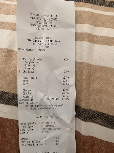Read moreThis location has been opened since October 31, 2024. (I write this February 2025.) I have given it an average rating because even bad Chick-fil-A is fairly good but this particular store needs assistance in making it as good as all the other locations. The mobile order line takes longer than the regular drive-through line and it isn’t in order of arrival or scanning the QR code. The servers while not rude just hand you your food and walk away with no opportunity to ask for condiments. I guess they figured that if you ordered on the app then everything is in the bag. But ketchup, straws, cutlery are usually missing. Add-on items such as sauces or different dressing or even requested extra blue cheese crumbles have not been included on my mobile app orders in EVERY order from the Seagoville location. I’ve tried numerous times and have been disappointed every single time. The biggest complaint is the grilled chicken on the market salad; it looks and tastes like grill scrapings instead of a sliced grilled fillet. I want to be happy that Chick-fil-A is in my town but it seems that the employees have worked too long at inferior fast-food chains and the patrons just need to be happy with what they get even if it’s not what...