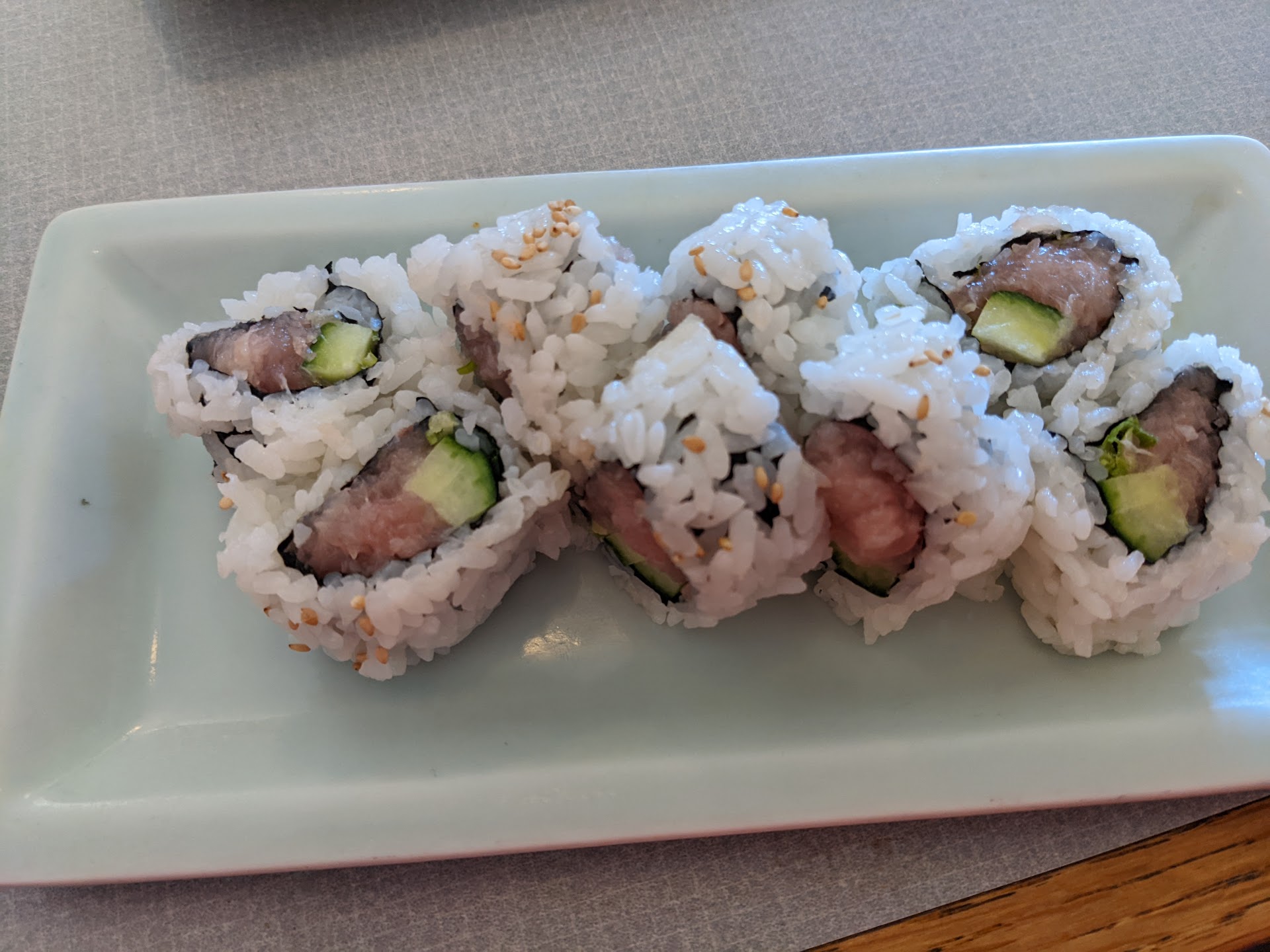 WORST SUSHI RESTAURANT EVER!!! DO NOT GO HERE!!! From start to finish this place should not be in business. We got old menus with old prices and got a huge surprise when we got the bill that had more expensive menu items. On the menu we got the price for Salmon Nigiri was $7.50 and the bill charged $8.50 and rainbow cali roll on the old menu we got was $18 an they charged us $19. The service was like we never got any. The sushi chef didn't understand our order and gave us both a cali roll and a rainbow cali roll, when we only ordered a rainbow cali roll, so they could overcharge us. We told the sushi chef we only ordered the rainbow cali roll and not the cali roll and he rudely pulled the plate from my hand and took the cali roll off as he rolled his eyes. The owner was also rude and didn't care he served outdated menus and we didn't get a water refill for 20 minutes and had horrible customer service. On top of all this the food was overpriced and disgusting. The salmon nigiri had no flavor and was not buttery at all. Same thing with the cali rainbow roll. We couldn't even order more food because we had no server!!!!!! Save yourself the time and money because after I left here I had to go home and...