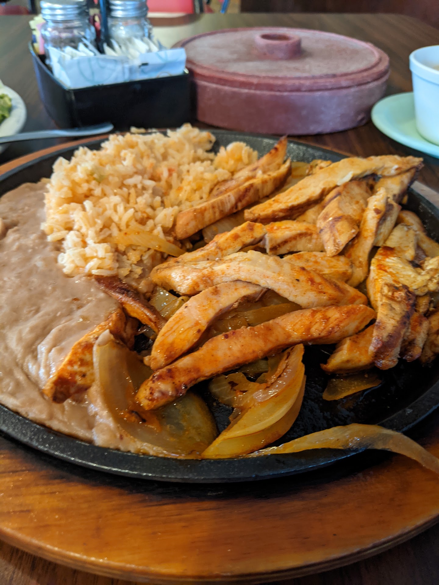 Read moreChicken fajitas were good. Fajitas come with onion and your choice of meat with pico, cheese, sour cream, chopped lettuce and guacamole. There weren't any peppers served with the fajitas. I am used to having some cooked bell peppers with the onion, but this did not detract from the dish.