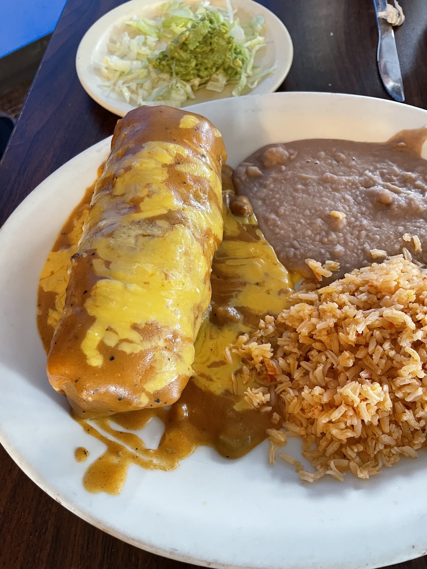 D17. Beef fajitas Burrito. 5/10 Topped with gravy, Cheese, Served with Guacamole, Rice and Beans Overall the dish looked great but the burrito had a huge lack of flavor. The refried beans and rice were blah. They both really had no flavor at all which was a real letdown because I love rice and beans. The gravy was ok but the beef fajita was over dry and flavorless. Appearances in this case were very deceiving.