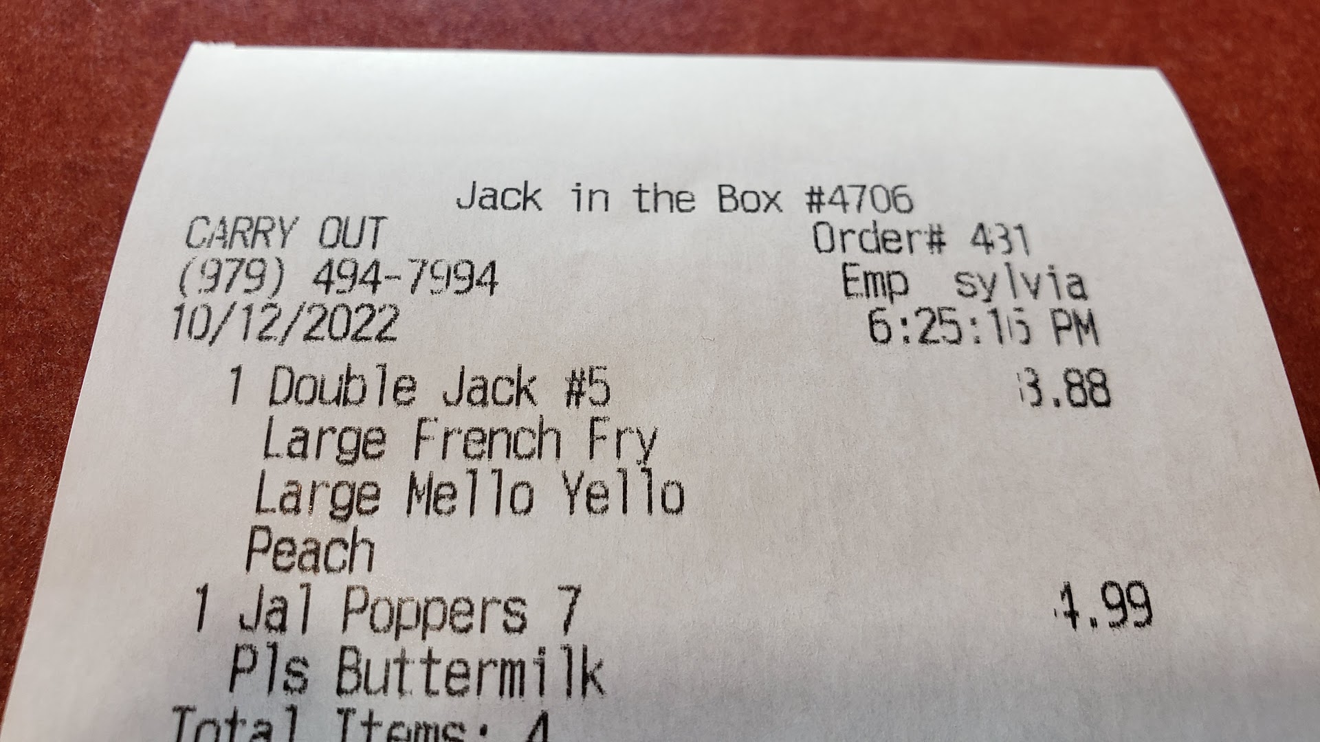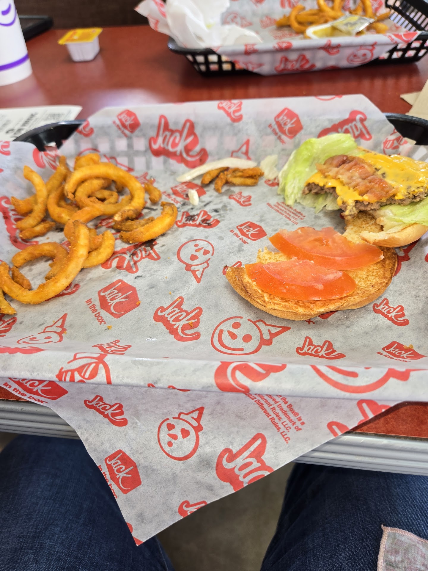 Read moreProlly the best Jack in the Box I've been to. I'm from Dallas and staying here for the night so I been to a few of them. All of the food came out piping hot and delicious! I had the number 5 Texas Double Jack meal and a 7pc cheddar jalapeños. Honestly, better than Whataburger. There, I said it. It is better and when Jack in the Box is done correctly, it's hard to beat. Saying a lot for this Lil 'ol town. Highly recommend! The "1967" tattoo guy gives great service and ensures the meal is delivered correctly. Only negative is the Freestyle machine was inconsistent so they made the drinks in the back, which isn't a...
