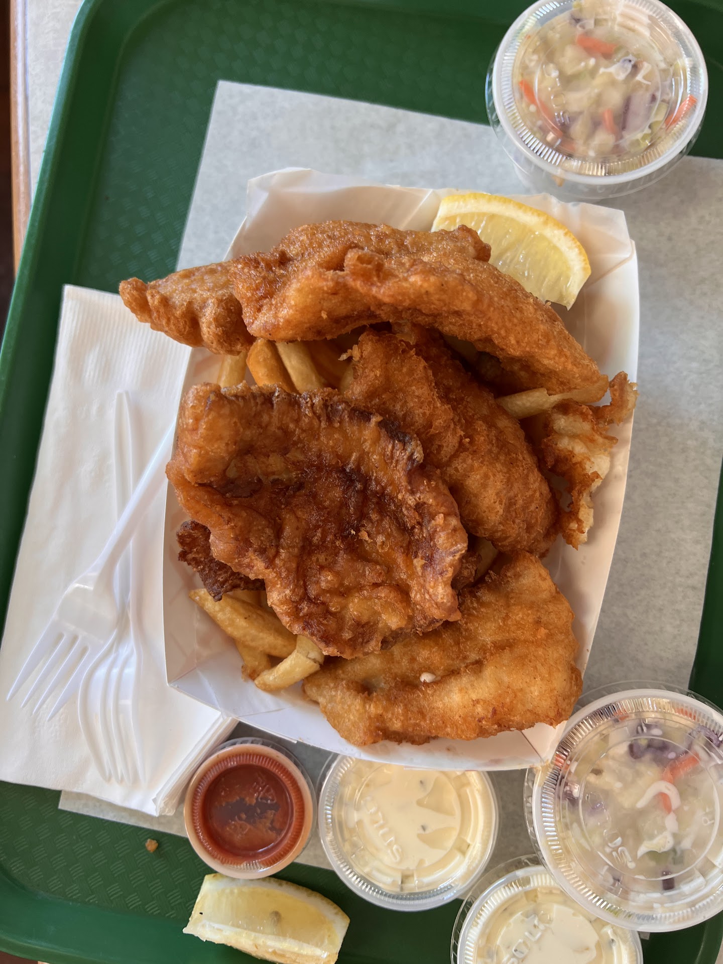 Read moreThis is the kind of place that just doesnt exist any more. The restaurant is actually attached to the fresh fish market next door and it's right on the river. My two brothers and I came specifically for the halibut fish and chips. Take my advice, get the 5 piece, because it's too delicious to stop at three pieces. The waffle cut fries are nothing to write home about, I really wish they would put some kind of house made seasoning on them, because I'm sure they would find a way to be famous for that too . That's just the food.... the customer service is what really sold me. I'll even put up with mediocre food if the service is good enough. This place makes you feel like you're visiting a family friend for dinner. After taking orders, the the waitress came over just to ask where we were from and chat, and make us feel welcome, while asking if we needed any thing. My brother is kind of particular about his fish and chips so the waitress and he gathered the condiments he was looking for. Then, the actual cook came out to talk to us, to see how the food was and just make us feel like guests. He told us how he makes everything from hand, never frozen. He's very clearly passionate about what he does. Do yourself a favor, HAVE...