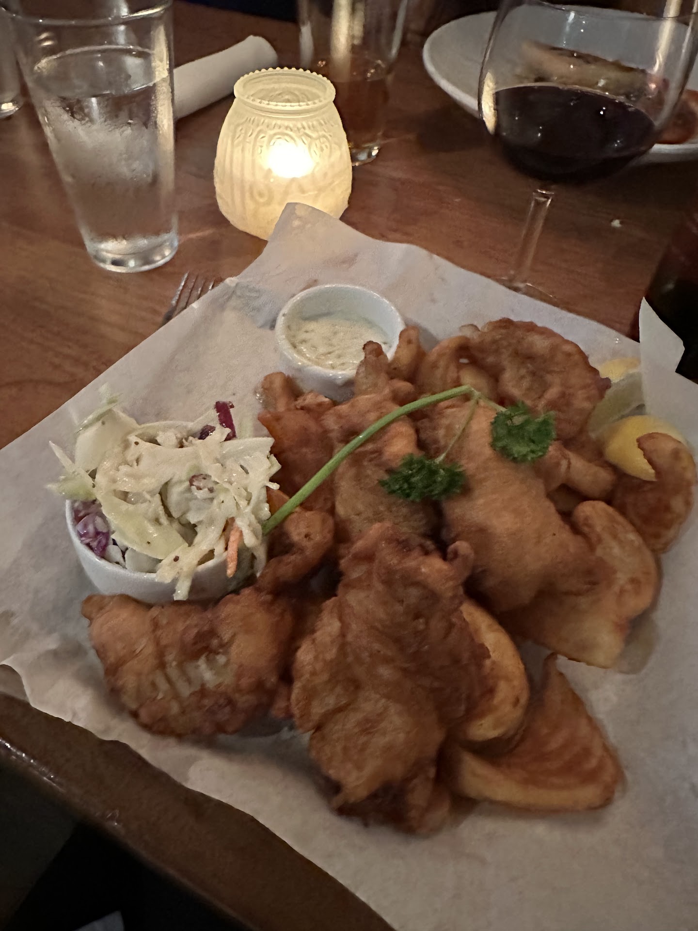 Things I loved: they were able to quickly accommodate our party of 10 on a rainy Friday night. when some in our party ended up not being able to come, they didn’t give us any gruff about it. We chose to shift our seats so they could break apart the big table into two smaller dining spots good was fantastic! started off with the sizzling mushrooms and the Brussels sprouts - it didn’t appear to be a ton of Brussels at first because they were in a single layer on a plate versus in a bowl, but it ended up being the perfect amount, and the sauce was fantastic. The sizzling mushrooms were amazing! Sorry, forgot to snag pics of those two dishes. fish and chips were great! Tons of crispy, flaky but not dry fish atop a bed of the most interesting fries I’ve ever seen. Imagine a steak-fry-size flat potato “wedge” but curved on both ends reminding me of a flower petal. They were really great and not soggy or floppy at all! I can’t stand underdone fries. multiple in my party had the gnocchi two ways and thought it was dynamite. They couldn’t decide if they liked the Gorgonzola or the marinara sauce better. Beef stroganoff and the prawn risotto rounded out our meal. There wasn’t a crumb left Bread pudding - absolutely incredible! I love bread pudding but everywhere I go people put raisins in it. Not here. A huge chunk that was perfectly cooked all the way through. There were no mushy parts and no dry parts. Definitely some of the best bread pudding had at a restaurant ever. I definitely recommend going but between drinks, dinner and dessert I easily spent $80 on my dinner. waitstaff was very friendly