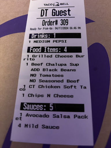 Anyway, this particular Taco Bell seems to have their best leadership during the lunch time. Each time I've been there during lunch...I receive HOT food, put together well and looks and tastes like the menu items. Further, they nearly never make mistakes on the order...which being an old time Taco Bell consumer means I special order many items to recreate items no longer on the daily menu. This store...during the mid day shift...does a great job.