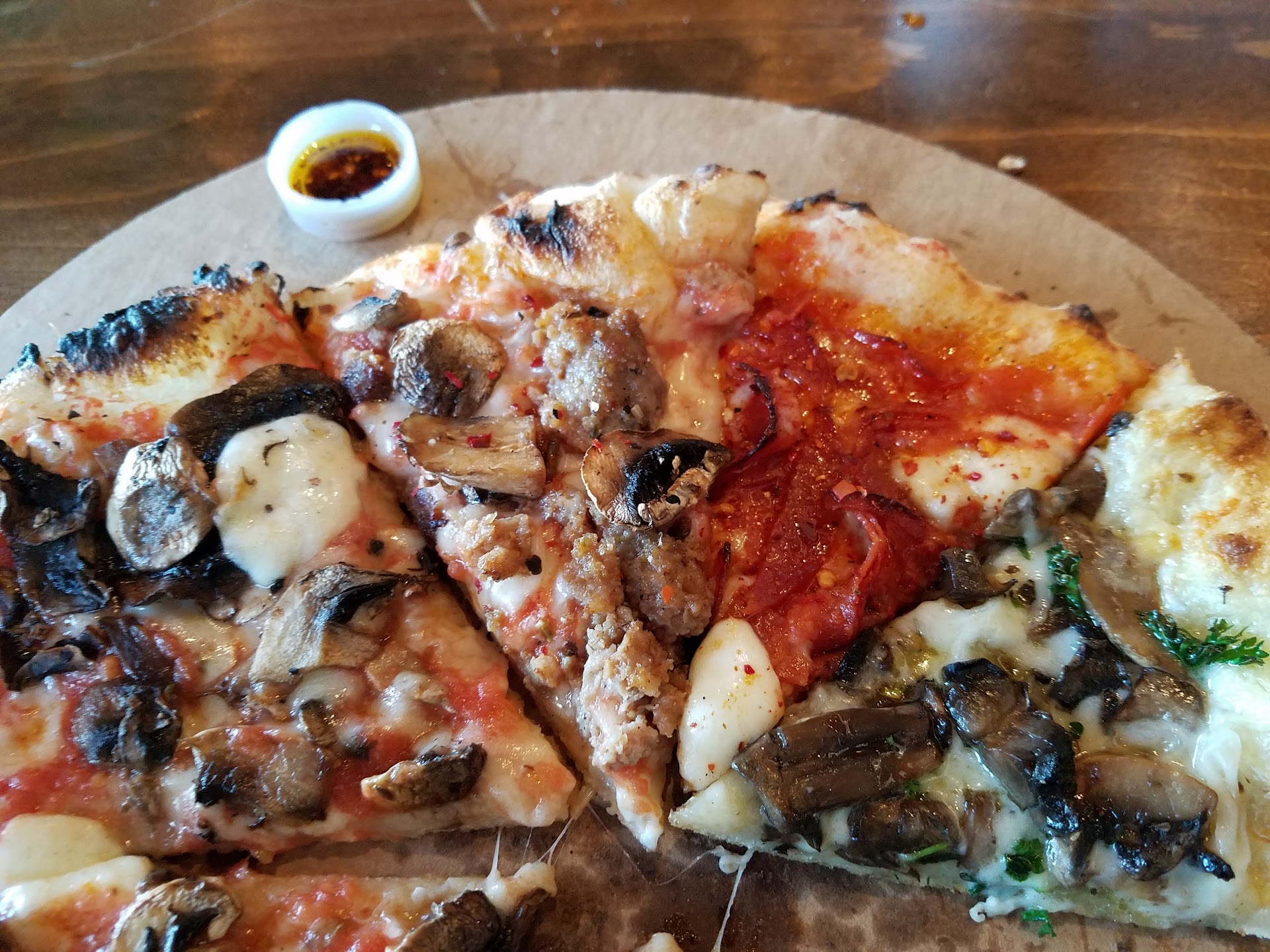 Fabulous pizza! My parents, my adult sisters and I went here when we came into Monterey for the weekend. We each got a different kind, which yeah, was a little expensive... but it was so good! The crust was delicious- chewy, not too thin or too thick, flavorful (especially with the chili oil, yummmmm). The sauce was a little thin, I mean there could have been more but I also like a saucy pizza, so that's just up to taste. Cheese good, toppings EXCELLENT. We got mushroom, mushroom and sausage, spicy pepperoni, and the daily special which was a white pizza with truffle oil and specialty mushrooms. My pic has all of them side-by-side, haha! Definitely personal size, unless you're like my older sister who was so stuffed she couldn't finish hers (so I did...). The only weird thing was the Christian rock music blaring.... just turn it off, right? We don't need music playing our way through dinner.... We can talk to each...