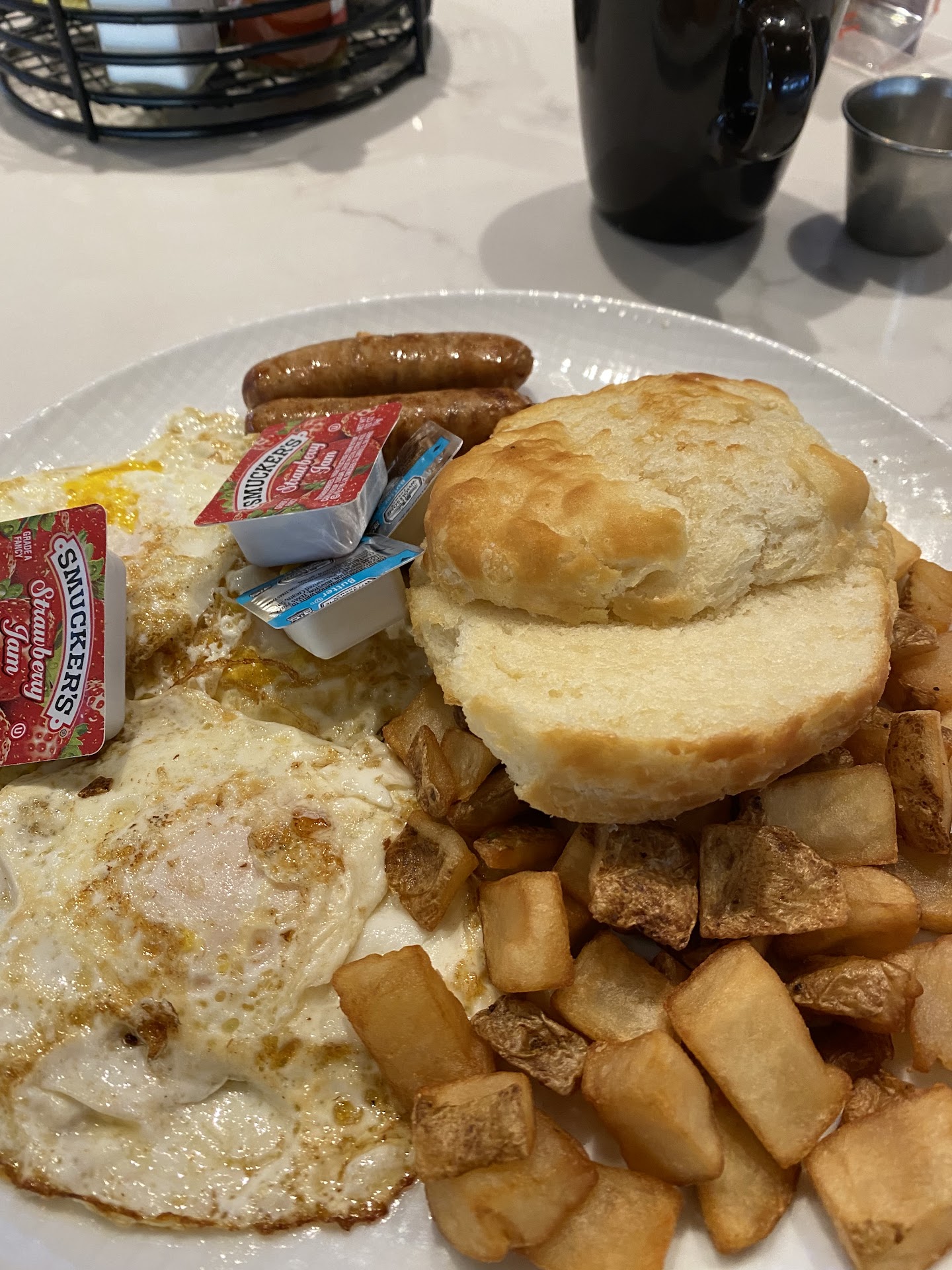 Read moreWe found a seat relatively quickly and had to order food on the app. You also have to put in a card to either pay immediately or âstart a tabâ. I opted to start a tab because I donât tip until I see the service Iâm going to receive. One waitress checked to see if we had ordered anything to drink besides water and we confirmed we had ordered apple juice. She was going to go grab that but never returned with it. Our food came reasonably fast but were missing 2 of 3 sides of bacon. Grabbed waitress again and they brought us burnt/blackened bacon. Granted the place was getting busy but you need to take care of your customers. We finished eating and still no apple juice and my daughter no longer wanted it. I asked the waitress to take it off our bill. I checked the app for 10 minutes and it still wasnât removed. We grabbed another waitress who got very testy about being busy and she would take care of it. The initial person we asked said she took care of it. Went back to the app and thereâs no longer a bill. We checked our bank statement and they had charged us the full bill +22% tip for a âdine and leaveâ situation. RIDICULOUS! We had to track down a manager who was finally able to refund us equivalent to the juice plus tip. The waitress shot us a nasty look as we left. Food is ok at best and very overpriced, but service is not worthy of a good tip. Check your bill...