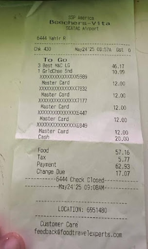 I gave them a chance to make this horrible situation good, sent an email, it has been 3 weeks, NOTHING!!! SeaTac Beecher's is the WORST!!!! I have gone to Beechers in other airport, Chicago, RI, and many times at the SLC location and have always had wonderful food, and great service. Not only did I NOT get that at SeaTac, but they are SHADY!!