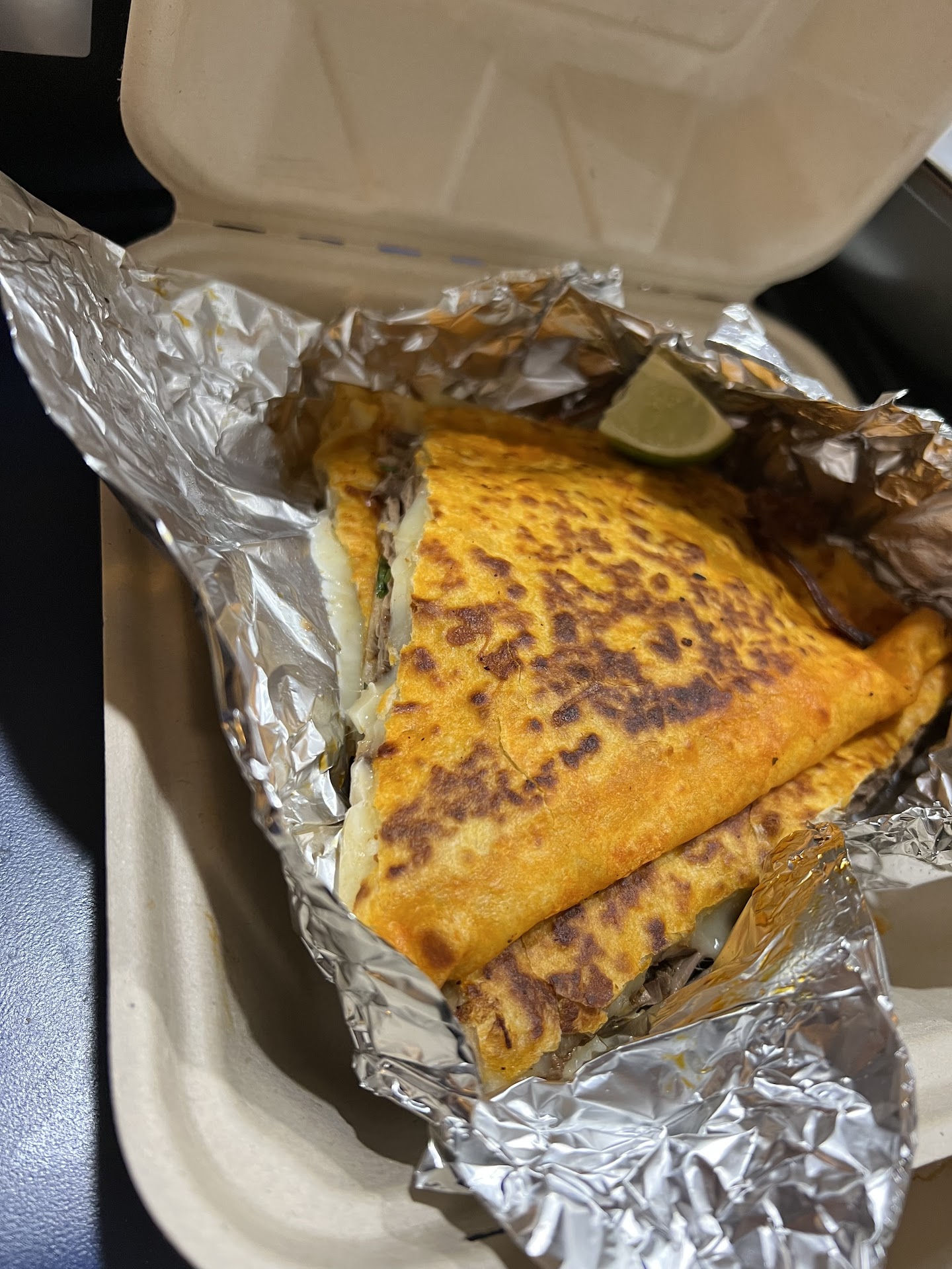 I ordered two tacos birrieria. I waited about 5 minutes. Grabbed my food and left immediately. Upon opening the box they put my taco in. It was just meat and tortilla that is it. There was no cilantro and onion or anything added to it. I said this can't be it. No way this place has five stars and serves tacos like this as if a small six-year boy made it. I was appalled by the waste of money because one bite was so dry and it was just meat flavor I did not taste any other spiced nor detect a flavor besides meat.