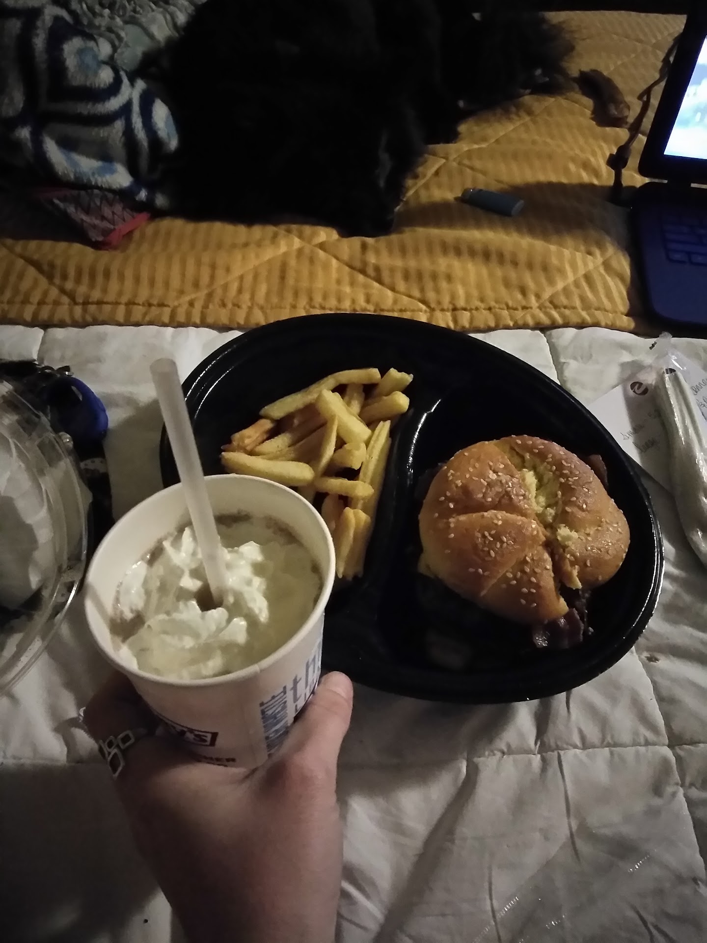 So where to begin. I got a hotel with my husband to finally get a night away from the kids. Decided to grab something to eat and figured if I'm gonna grab burger might as well get something better than jack in the box which was next door.....Well jack in the box would have been a way better experience. First when I pulled in at about 12:45 @ night we stayed in our car waiting a few mins because there was a handful of homeless people standing out front and being female I chose to avoid being heckled by them. After waiting in my car for about 10 minutes they all dispersed into vehicles and got comfy for the night. As I walked in to get a bite to eat there was 2 men standing by the door smoking weed. Now even though it is legal, smoking anything 25ft from a door here in wa is illegal. Now when I went in I stood waiting for someone to even notice me for about 4-5 mins till Tony finally noticed me and didn't want to just take my order he also was trying to take me home. I told him we would like to take a look at a menu and it would be a few moments. With that he gave me a menu and walked out. We decided to get some good burgers and shakes and looked to see where Tony was at, well he was outside with the 2 men smoking weed joining in. After a few more minutes of me standing at the front counter a young lady came up and asked if she could help us in any way, as I was about to place my order, here comes Tony running in smelling of weed and pushing his co-worker to the side saying he would take our order. I placed our order of 2 burgers and 2 shakes and was shocked at the $35 price tag. Now knowing that I just paid $35 bucks I was hoping for a great meal, well I was sadly mistaken. I told Tony I was going to potty my dog outside and smoke a cigarette while I waited, I even asked him to let me know when it was done. After spending about 10 minutes outside I went in to find my food bagged and sitting on the counter. I went to look into it and see if it really was mine to have a gentleman from the back ask what I was doing. He said that yes that was mine and I was good to take it. At that point Tony comes from somewhere asking if there was anything else he could do, I asked for a drink carrer, which at that time Tony disappeared. We decided to leave and made it back to our car. Which at that time there was 4 vehicles around us with people sleeping in them. We got back to our room which was a 3 min drive from Denny's to find our shakes completely melted, and our cups not even full. It had looked as if they had made one shake and split it between 2 cups. Now my dog eats anything and everything and I should have known something was wrong when he didn't even want to eat a peice of bacon from my burger. About 20 mins after eating half of a soggie, oily and just hands down horrible burger my husband became ill. He spent the rest of night having the burger and to tot balls come out either end.