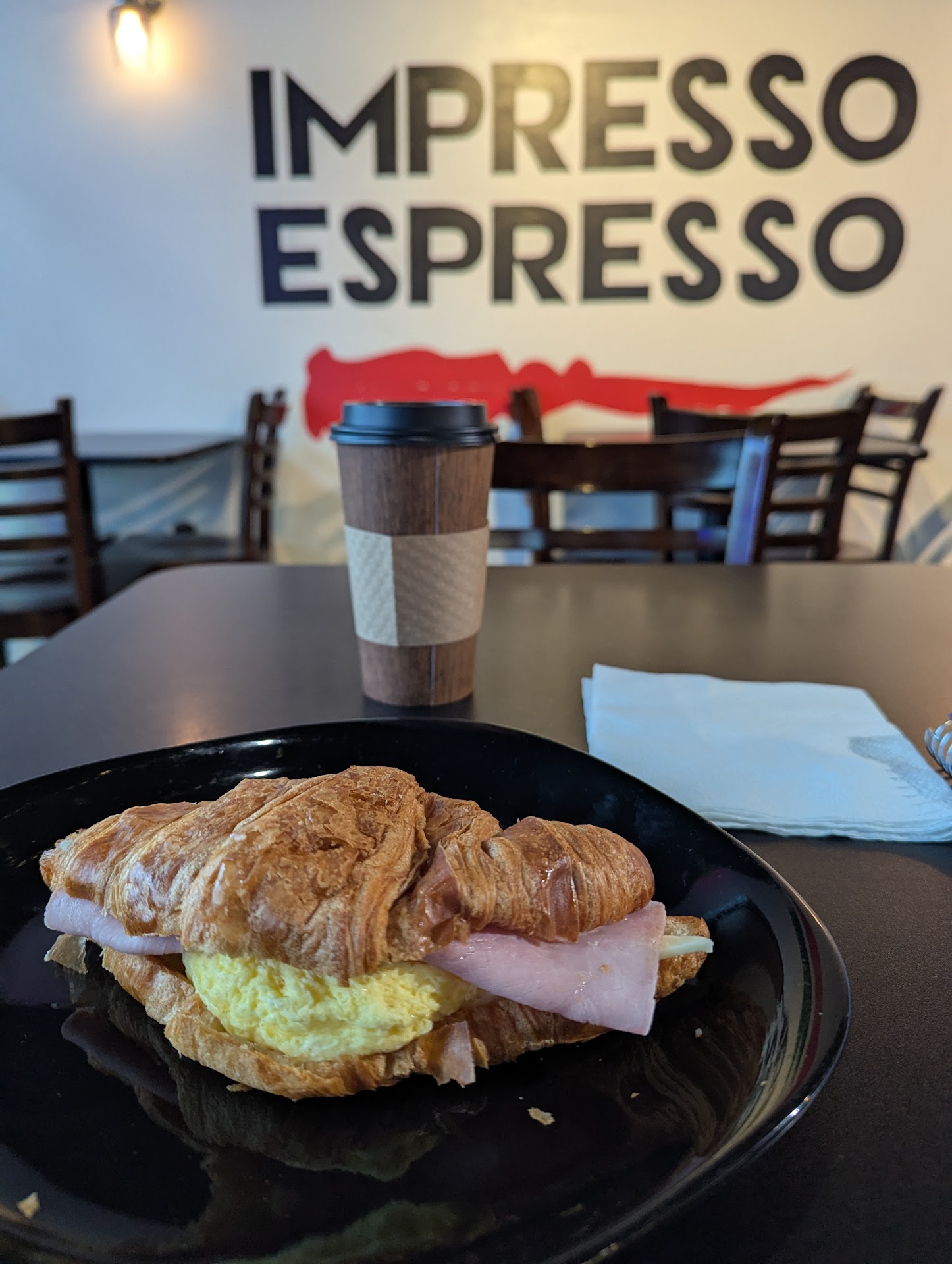 Comfortable cafe offering drive-through service. There's also plenty of parking in the plaza. I arrived a little after 6am and ordered a much-need cappuccino and breakfast sandwich (I chose croissant, ham, and pepper jack cheese). I'd reviewed pricing on their menus online in their personal website, and it is very, very outdated with pricing. I've uploaded a few pictures of their in-cafe menus here for future customers to reference. They also serve some fancier drinks like honey lavender lattes, which are advertised on the shop windows (not pictured).