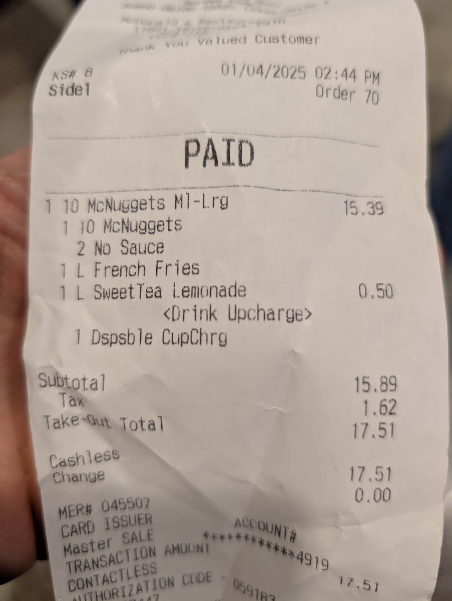 Read moreThe pricing is now just obscene! I had to feed my kid, but given how overpriced this fast food is, I decided not to order anything for myself; because it's not worth it! Btw, my son's fries were soggy. Overpriced and poor quality. McDonald's used to be considered cheap and convenient and you don't even have a person to talk to anymore. So, they're cost-cutting and charging obscene prices for poor quality food. Next time, I'm just going to find something else and tell my kid that McDonald's isn't an option. I'd give 0 stars if it were an option, but 1 star is all they offer. Take a hint McDonald's! If you're going to charge ridiculous prices, at least have the decency to have something worth the price of admission. I'm done with McDonald's, this was my breaking point. This is the last time I'm willingly ordering anything at McDonald's because it's simply...