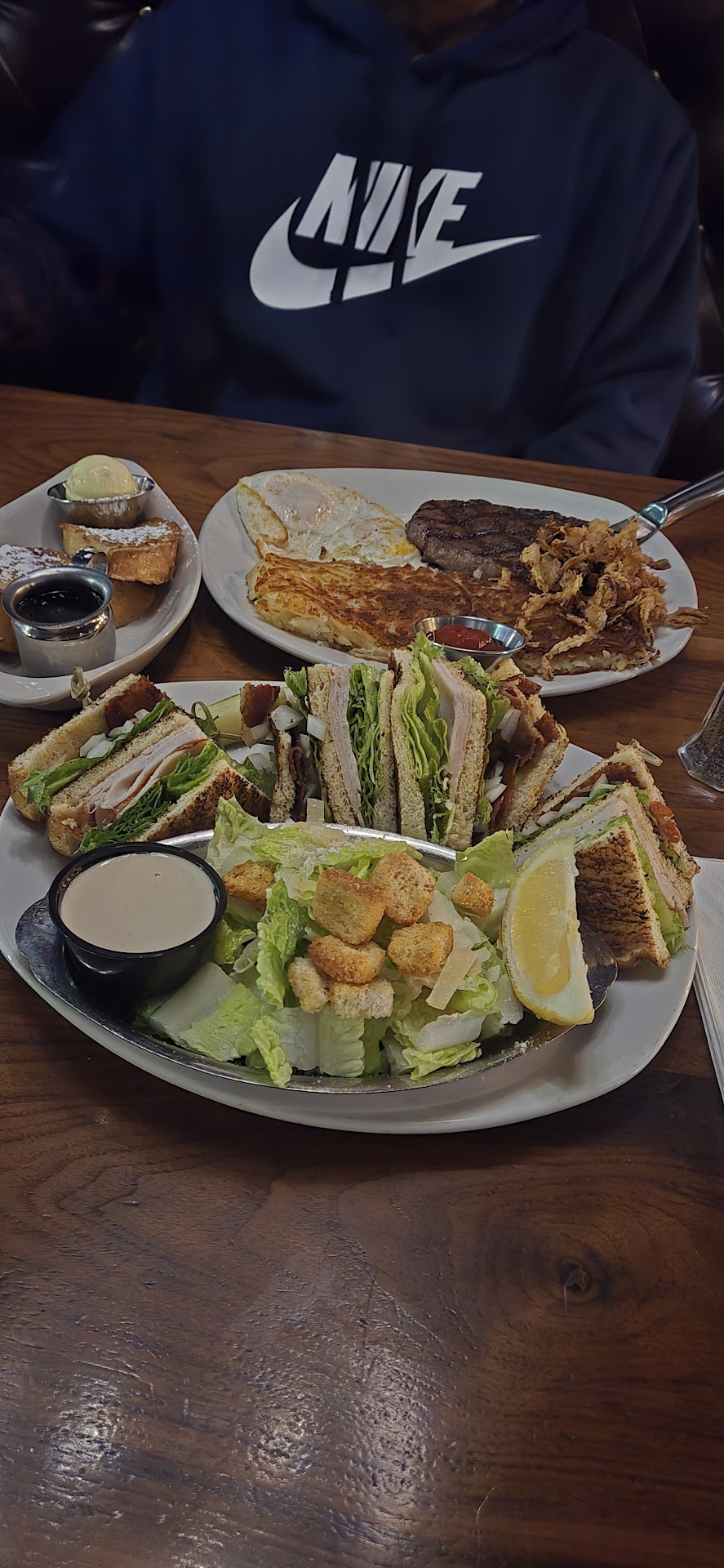 So disappointed! I loved this place when I was here for a summer back in 2022. My boyfriend and I flew into town on Christmas day (yesterday) because my best friend flew down from Alaska for surgery on the day after Christmas (today). I couldn't wait to bring them to 13 Coins for a great steak and those garlic mashed potatoes! I wasn't sure about our timeframe, so I didn't make a reservation, but I called and they said no worries, they're taking walk ins. Cool. Arrived at around 6:30pm on Christmas and the restaurant was half empty but we were told there was an hour wait because the kitchen was backed up. We were totally fine waiting due to holiday, no RSVP and kitchen issues. Okay, can we just be seated and get drinks going so we can visit and catch up until the kitchen is caught up? No. Can we sit in those chairs right by the host stand that face the cook line while we're waiting? No. Ok cool, can we wait in the bar? Yes. So we went to the bar and ordered drinks. After about 45 minutes the bartender said he could take our food orders, we didn't have to wait for a table- if we didn't mind eating at the bar. (thought the wait was because the kitchen was behind, not lack of tables- but whatever!) So, we order the NY strip, med, with garlic mashed potatoes, 2 ribeyes- one med and one medium rare- also with garlic mashed potatoes, and two salads. It took awhile still but salads finally came and were delicious. Then about 30 minutes later our entrees came out. The NY strip that was ordered medium, came out rare- VERY rare. And with a side of noodles instead of garlic mashed. MY ribeye was ordered medium and was a tad under, which was still ok, except that it was cold and with a side of some potato pancake things- not garlic mashed- also cold. The other ribeye -ordered medium rare- came out medium to medium well (no pink) and also had the cold potato pancake things instead of garlic mashed. We ended up asking for the NY strip to be re-cooked because it was just way too rare for any of us. We made due with the ribeyes- one cold and one overcooked. Asked about the lack of mashed potatoes and were told they ran out hours ago. Don't know why we weren't told that when we ordered??? Anyway, they re-cooked the NY strip and it came out medium rare to almost rare again instead of medium. Whatever. We didn't want to send it back again and wait again. Oh! And it came out with garlic mashed potatoes!!! Thought they ran out hours ago?? We ended up taking most of our meals to go thinking we could heat them up in the microwave back at the hotel and that might make them not only hot, but the right cook temp as well. Alas!!! No microwave in our hotel room!! đ„ș And although the atmosphere was very nice, the floors and restrooms were filthy.