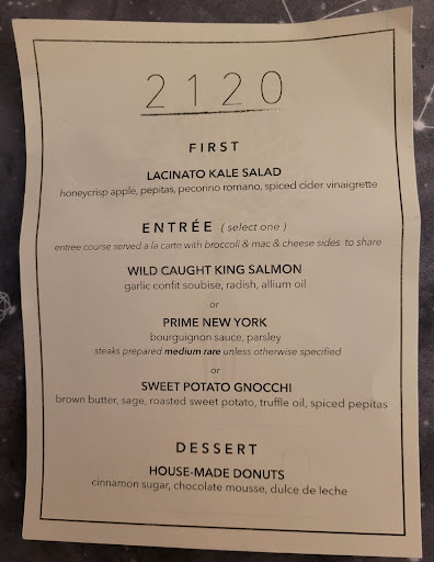 Nestled beside the iconic Amazon Spheres in downtown Seattle, 2120 is a beacon of New American cuisine that effortlessly blends sophistication with warmth. My recent visit to this gem was nothing short of spectacular, leaving me eager to sing its praises. From the moment I arrived, the ambiance struck a perfect chord. The sleek, modern interior, accented with warm wood tones and soft lighting, felt both upscale and inviting. The heated patio, offering glimpses of the bustling city and those distinctive Spheres, was tempting, but we were in gor a private party. The atmosphere buzzed with a mix of professionals unwinding and friends celebrating, all underscored by a playlist that was just the right volume for conversation. The service was a masterclass in hospitality. Our server, Amanda, was attentive, knowledgeable, and genuinely passionate about the menu. She guided us through the seasonal offerings with enthusiasm, recommending dishes and wine pairings that elevated the experience. Her suggestion of a crisp Pacific Northwest Sauvignon Blanc was a flawless match for our starters. The small plates set a high bar, and the mains didn't disappoint. My sister in law chose the duck breast with pastrami spice rub, served with sweet potato puree and creamed mushrooms. The duck was cooked to perfection, juicy with a crisp, flavorful crust, and the earthy, rich accompaniments made every bite a delight. My husbands king salmon, paired with apple-brandy butter and charred onion, was vibrant and impeccably fresh, a nod to Seattle's proximity to pristine waters. The cocktail menu deserves its own applause. The 2120 Spritz, with citrus-infused vodka, sage syrup, and a splash of sparkling wine, was as beautiful as it was refreshing, arriving with a delicate butterfly pea flower garnish. It was the kind of drink you snap a photo of before sipping. Dessert was the grand finale: house-made doughnuts dusted with cinnamon sugar, served with dulce de leche and a decadent chocolate mousse. They were warm, fluffy, and indulgent, the perfect sweet note to end the meal. Paired with a robust espresso, it was pure bliss. What sets 2120 apart is its commitment to local, sustainable ingredients, evident in every dish. The menu evolves with the seasons, showcasing the Pacific Northwest's bounty, from fresh seafood to farm-fresh produce. Add to that the thoughtful wine list, heavily featuring regional gems, and you have a dining experience that feels deeply rooted in its place. This wasn't just a meal--it was a celebration of flavor, craft, and community. 2120 delivers on every front: exceptional food, stellar service, and an atmosphere that makes you want to linger. Whether you're a Seattleite or just passing through, this restaurant is a must-visit. Five stars, and I'm already dreaming of my next reservation. We were even checked in on by the...