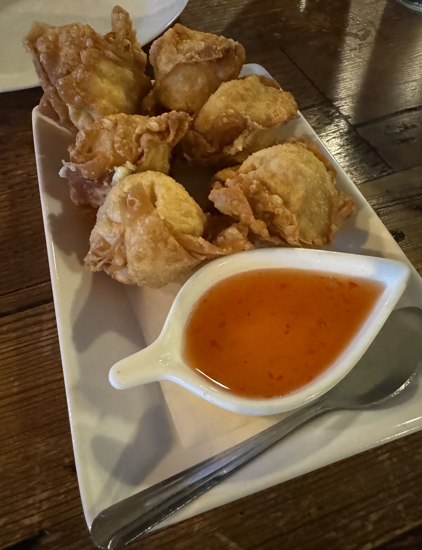 Food - everything we've had has been great! Some favorites include creamy crab (perhaps our favorite version), all the curries (green curry with avocado! red curry with pineapple and grapes!), the woks (especially garlic and ginger), and when we're eating in, crispy chicken. All spice levels are appropriate to the way they're labeled. Service - this is clearly a family or close knit group of folks working here. We are greeted like regulars every time we come in. I always feel like I'm an important customer. We live under five minutes away by car and under 15 minutes by foot; it is not uncommon to order food, immediately get in the car, and have the food come out from the kitchen while signing the check. Walking and calling our order in halfway results in similar timing. Atmosphere - open and airy. A fun tea display and also a fun wine bottle display. TV in the bar with sports. Plenty of tables in the main area and bar stools and tables in the bar area.