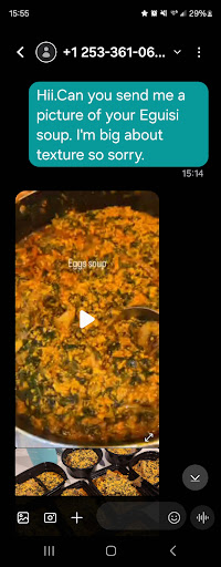 I ordered from this lady, it's out of her home. Orders are to pick up & to go only, The eguisi & fufu were good! And it was my first time trying this. It was kinda spicy like I love. I only wish I knew what types of meat/ fish was in the soup (maybe post it in the description for future orders) all least for comfort and peace of mind of what we're eating in that soup because it looked like miltiple meats. Also the fufu was semi warm since it had to microwaved; as it was in the fridge when i picked up, she kindly warmed it up before giving it to me. I think I paid $22 for 6 in width/2 in deep bowl and two fufu balls that were decent size. (I would preferably pay like $17 in my opinion, since there is no seating, and the fufu wasn't hot all the way through or fresh off the stove- Nothing wrong with it cool in the fridge prepared but warmed through would be bomb for the meal experience) This was during a non summertime season last year, so im looking forward to when this summer hits, because maybe she may have her garage open with her signs out and food ordering table outside....instead of her signs & table inside the garage. I personally didn't mind this, plus the home was nice and pretty on the outside. And when she went inside, it looked neat inside too from the glance. Good first experience. Good job AFRICUISINE! ❤ I would try this again...