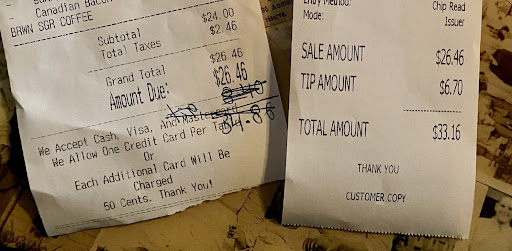 So, our auto-grat went from $33 on the first check to $42? How does that work? We then asked for just the bill to be printed, no tips written in on our behalf, so we can include a tip amount ourselves. To this, the woman scolds us for attempting to avoid tipping at all (literally not what we’re doing), and that it’s policy for them to include a tip on tables five and more.