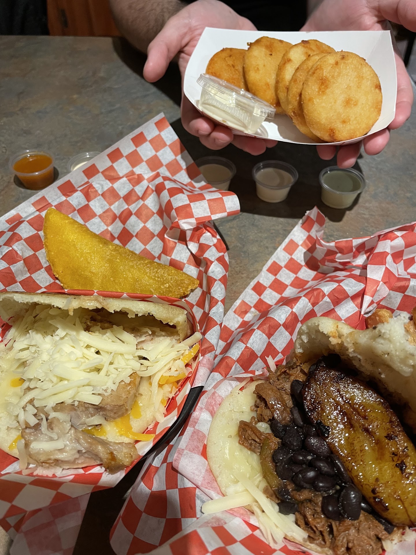 AREPAS: my first time eating it and it won’t be my last!! The sweet plantains were so good and one arepa was sooo filling! I was full for hours!!! The shell was very crunchy and they loaded it UP! Add an extra egg in it! So delicious. We got the #4 - pabellon!