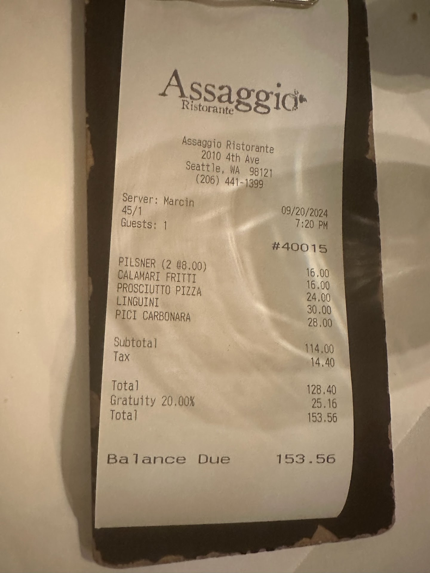 On September 20, 2024, my friends and I dined at Assaggio Ristorante in downtown Seattle while traveling. Our party consisted of 4 people—3 adults and 1 child. As the only Asians in the restaurant, we appreciated the host’s thoughtfulness in providing a booth table to accommodate the child. Unfortunately, our dining experience, and ultimately our trip, was ruined by the behavior of our server.