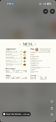 Read moreBasil Viet Kitchen offers a delicious and well-rounded Vietnamese dining experience with a menu that balances authentic flavors and variety. The appetizers, such as Spring Rolls and Pork Egg Rolls, are fresh and flavorful, while the classic Pho options are satisfying and come with generous portions of meat and vegetables. The beverage selection, including Vietnamese coffee and Thai tea, is a great complement to the meal, and affordable extras allow for customization. The staff provides friendly and attentive service, creating a welcoming atmosphere that makes Basil Viet Kitchen a wonderful spot for both casual meals and group gatherings. Highly recommended for anyone craving quality Vietnamese cuisine in a...