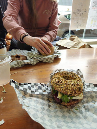 Came in the afternoon, no line but we wanted two veggie bagels but they only had enough mushroom for one sandwich. Which was fine. I ordered a veggie sandwich on garlic bagel. Unfortunately they ran out of vegan cream cheese but they subbed a slice of vegan cheddar. The garlic was a bit too charred so it tasted bitter. It was an alright sandwich. Also ordered the tofu with vegan cheddar. This tasted pretty good and would order that again.