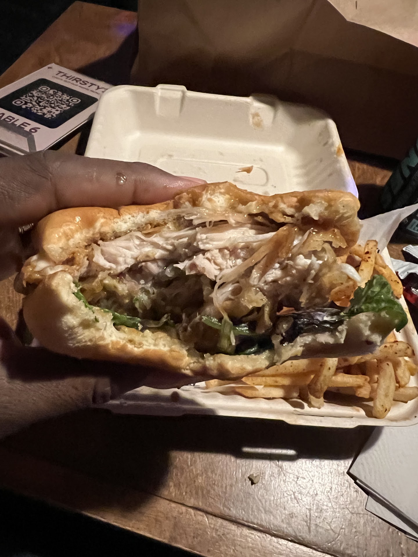 The food was ok. The Sesame Soy Garlic Chicken Sandwich was flavorful and extra crispy. My first bite reminded me of a tripe sandwich. The chicken thigh was a bite tough and slightly overcooked. The fries were seasoned well, but got soft and cold pretty quickly.