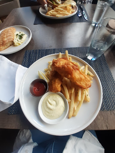 The fish and chips was really good. The fish was juicy and crisp, and the fries were tasty. The burger was fine. Nothing amazing but it was tasty and that's all we really wanted. We asked for it medium and it came out a perfect medium.