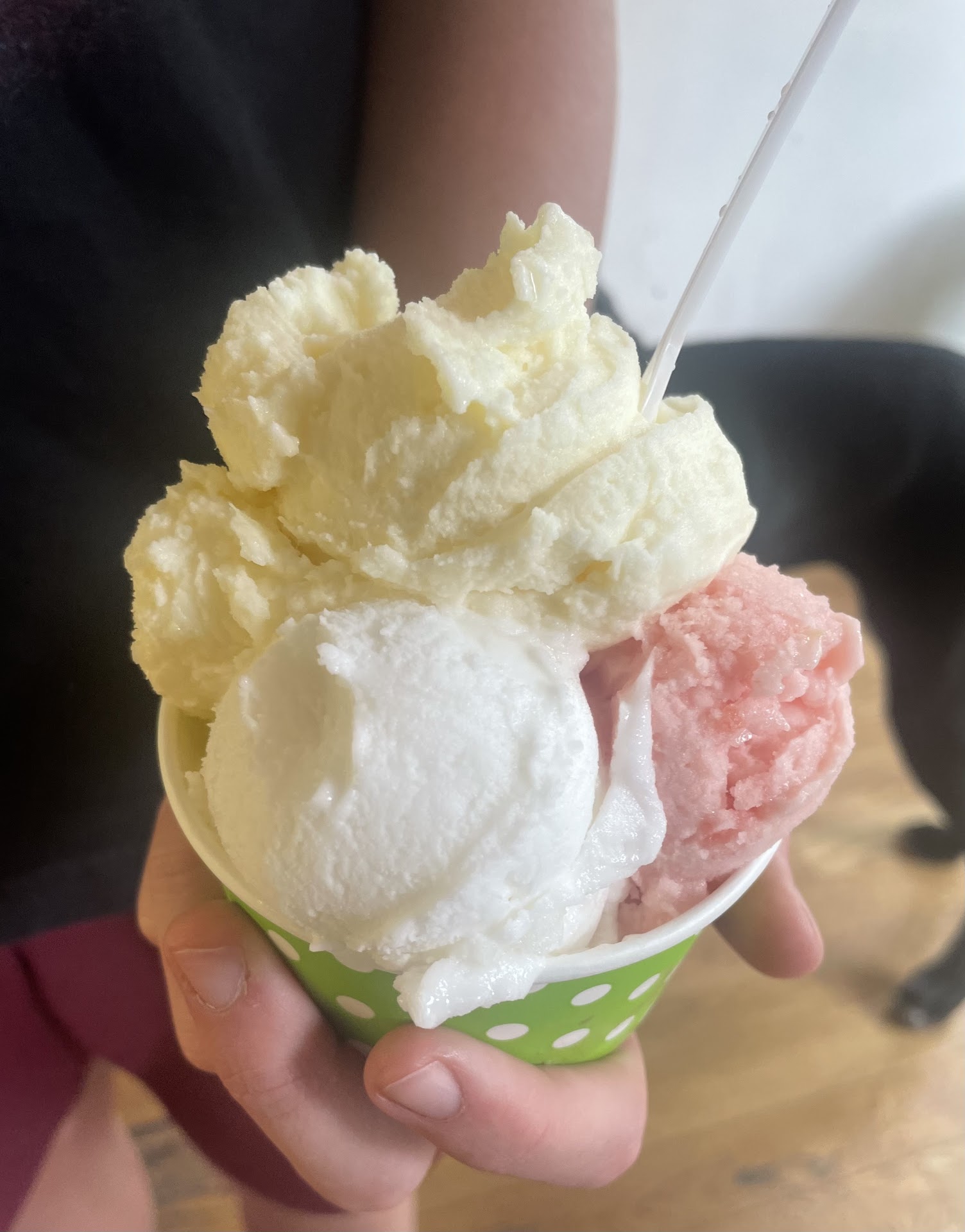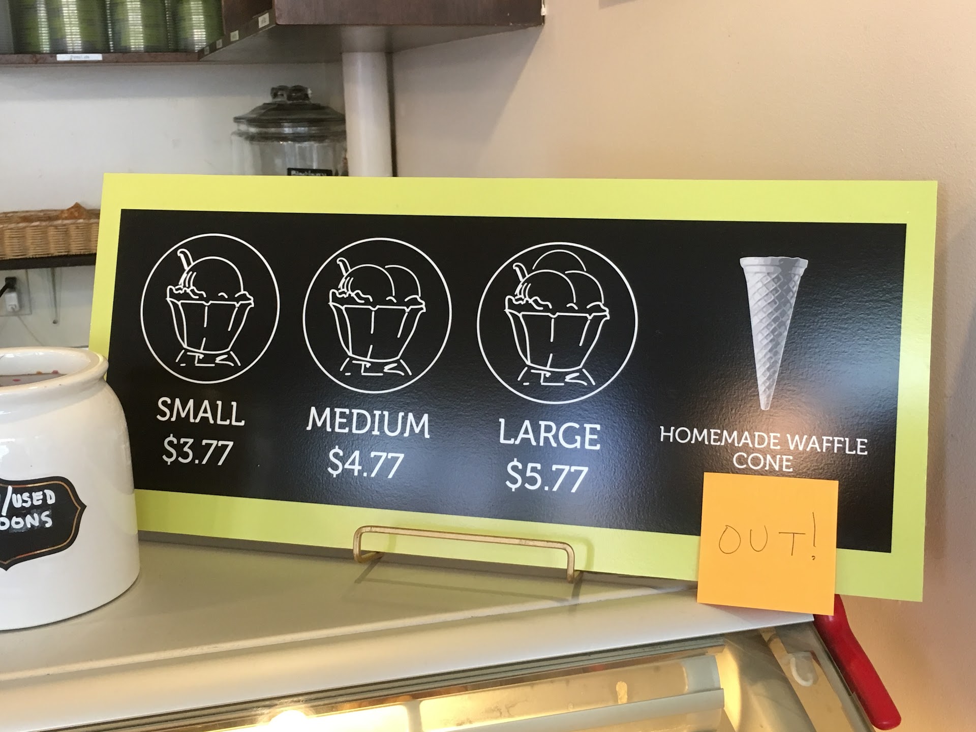 They had homemade waffle cones, which is usually a plus. Unfortunately, these were the worst waffle cones I've had in a long time. There was a sign saying they were sold out, but I saw an active waffle iron and a few cones that were obviously rolled recently so I asked about it. My cone was unusually oblong and slightly burned, and my wife's cone had a large hole in the bottom. The other cones that were rolled before we left looked even worse.