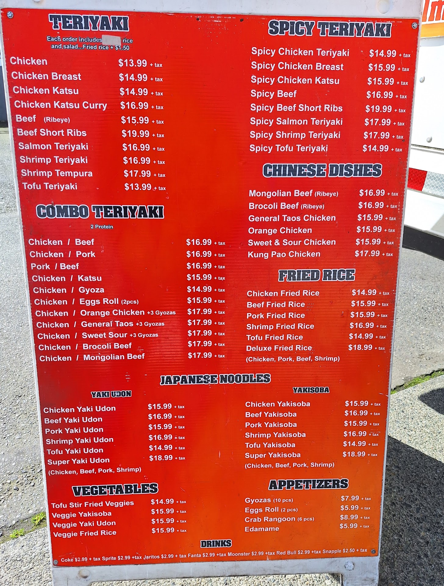 Read moreI found this place on chef Kenji Lopez-Alt's YouTube series of Teriyaki Chicken spots in Seattle and stopped here on the way to see the Ballard Locks. We ordered the teriyaki chicken plate, chicken fried rice, teriyaki tofu plate, and tofu yakisoba. I was blown away by how fresh everything tasted. It took about 20 minutes for our order, which was easy while waiting inside our car. Everything was hot and seemed to be made to order. Incredibly impressed by the vegetables used in some of the dishes. The vegetables seemed to be cut or shredded by hand and were crisp and fresh! Everything was really tasty and the portion sizes were really generous. Our family of 4 ended up having the leftovers for dinner. The gentleman working in the cart was very nice and friendly, helping us with order recommendations that did...
