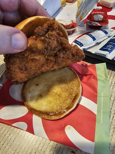 Read morePart of this was my fault, but I had a mobile order and...well, apparently I put that was going to pick it up inside, but I went through the drive through instead. They got me my food. That was the good part. The first lady almost asked me to get out of the drive through line (even though that's a totally valid way to pick up your mobile order) and she would've made me if I wasn't already trapped. It almost made me feel like it was a guilt trip for being in the wrong place, but, in my defense, I asked them to make it before my five minute drive there and there was no link to tell them I wanted to pick it up in the drive through like I've seen in the past. I wasn't in the right attire to be inside at all. Or I would have skipped the wait and just done that. They asked me four different times what I ordered before I got to the window, and when I finally got my order? The shake was melted and the food was still warm, but barely. The cheese wasn't even on top of the chicken...like it had slid off while it was sitting there waiting due to sitting at an angle or something.
