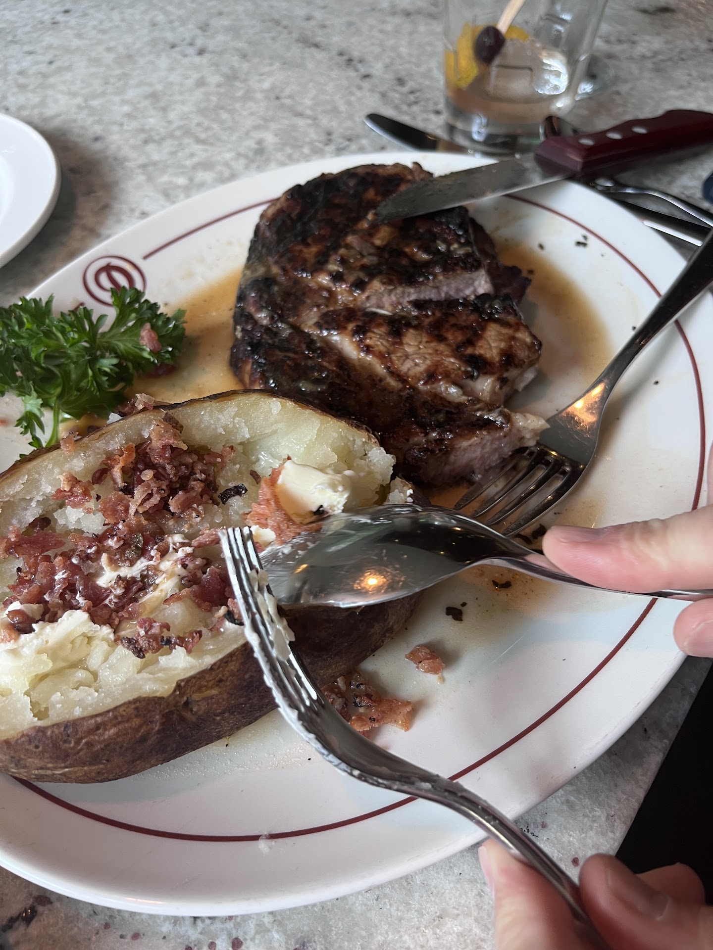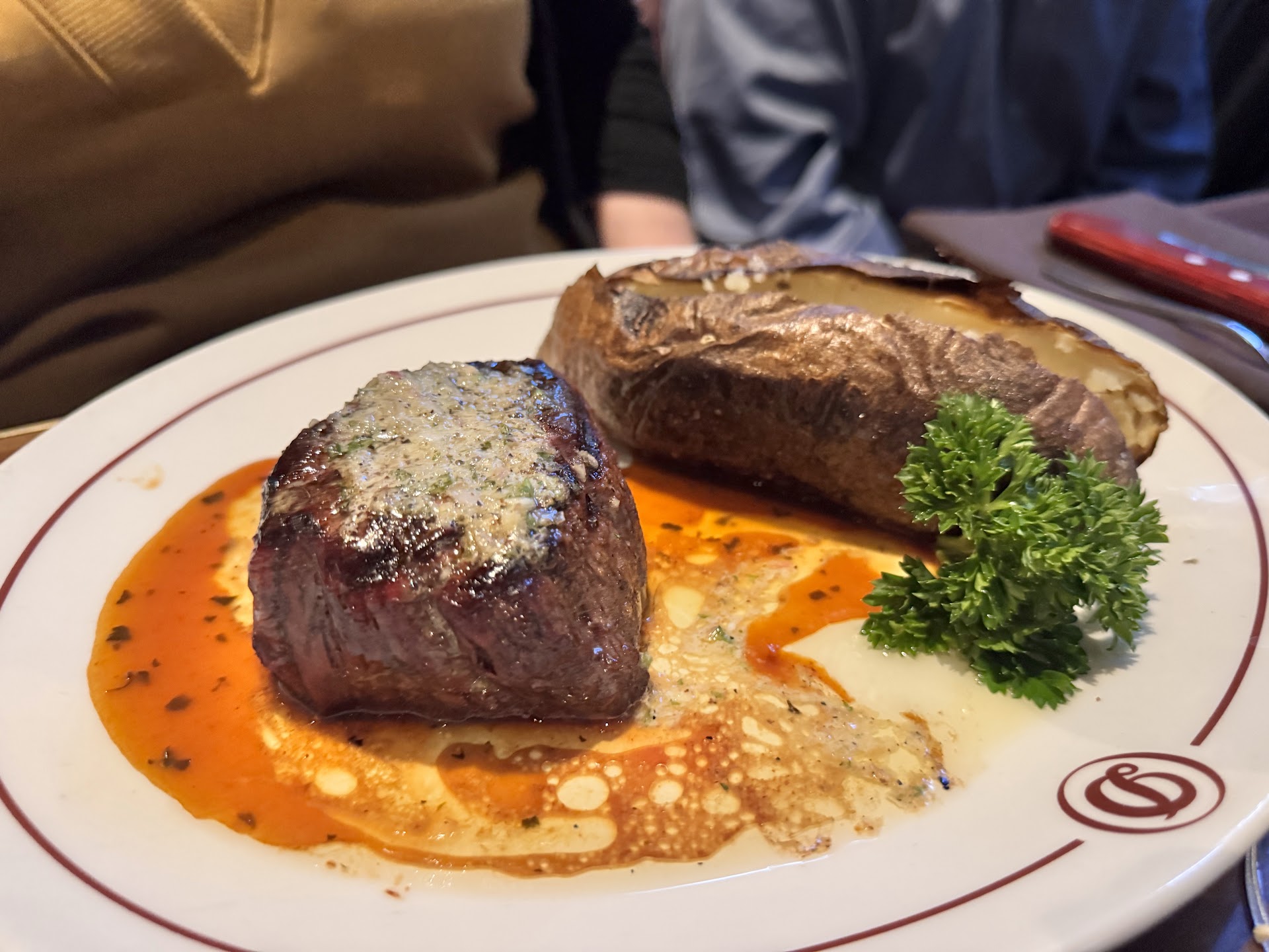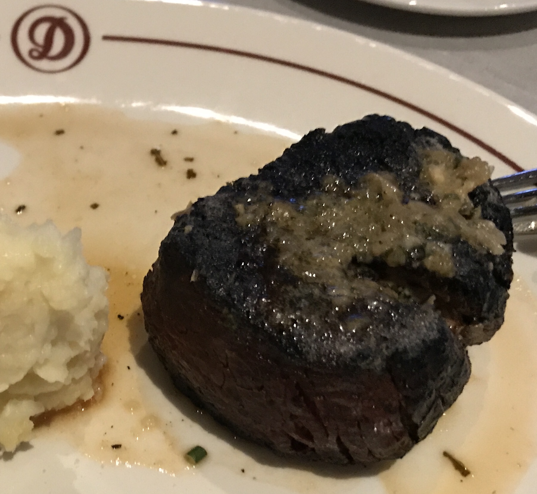 Read moreI have been to Daniel's Broiler before and I really enjoyed their food. However, that was at the South Lake Union location. Unfortunately, I was super disappointed at the downtown location. My husband and I ordered a chowder, Daniel's cut fillet mignon and grilled swordfish. While the chowder was served very quickly, we had to wait quite long for the rest. Our waitress came twice to tell us that "it will be ready soon" and explained that this long wait was caused by my fillet mignon that I ordered well done. Quite frankly, I have never heard anything like that in any restaurant and I always order well done steaks. Finally, after about 45 minutes, my steak was served. It really was well done. It was VERY WELL done. Or I should probably say - it was overdone. It had a thick layer of black crust atop that looked very much like charcoal. It was not edible and in order to eat the rest of it, I had to cut that off. I am not a complainer or a picky customer, but that exceed my imagination. According to Daniel's Broiler's steak cooking guidelines, steaks are defined in the following way: "rare: red throughout, cool center | medium rare: red center, warm | medium: pink center | medium well: slightly pink center | well done: broiled throughout, no pink". I do not see anything in these guidelines about charcoal curst atop of well done steaks. If I knew about that different approach to grilling steaks, I would have considered a different meal or maybe different order of my steak. Unfortunately, we were in hurry as we were going for a concert that evening at Benaroya Hall and I did not have time to do what I should have done - return it to the kitchen. When we were done eating, a manger asked us how was everything. Apparently, he did not believe me as did not offer any remedy for that except for "contacting him on our next visit". Well, I am not sure if that would happen any time soon as paying about $100 for mashed potatoes served with a small chunk of meat is not what I consider the best way of dining out. PS. My chowder was very tasty. And my husband was satisfied with the swordfish.