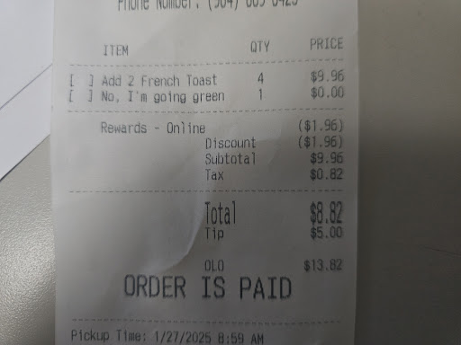 Read moreI had a poor experience today that will result in me not returning to this location in the future. I have placed this order several (3 times min.) times at this point and had no issues until today. On the mobile app under sides I order 4 orders of their french toast (2pc ea.) For 8 pc total. They're 2.49 per 2 pc and on top of that, I tipped them $5.00 (%50 pre-tip). I get there and upon checking my order, I noticed they gave me 4pc and not 4 orders that I paid for via the app. I went back in thinking its a simple mistake, something anyone could do no big deal. However, when I brought it up, the gentleman started arguing with me. I should have gotten his name, but he's an older gentleman maybe in his 50s, gray hair, and black rectangle rim glasses. He was wearing a black dress shirt as well, seemed like the manager maybe. He kept bringing up add-on and how I needed to order a meal. I explained to him and even physically pulled out my phone and showed him how I order this on the app and that I am NOT required to purchase extra food or a meal to get the remaining french toast I had already paid for on the app. He made a comment again about the cost and I showed him on the app that the cost was the same, the only difference is I used a %20 discount this time. He laughed and said "theres no such thing". He was very rude and unprofessional. It seems like pretty poor management to have somebody like that in a higher role that doesnt understand their menu and worse, argues with the customer about it and laughs at them making them feel stupid. Again, I had placed this order several times before and the rest of the team seemed to understand. For some reason today, this specific gentleman wanted to pick a fight and argue about the prices on the app. I now cant return to this retaurant out of fear of him trying to shorten my food again that I aready paid for. **Update: I found out the last 4 pcs I had to argue for were inedible. It tasted like butter and burger grease and the bread was so soggy it was complete mush on the inside. This was obviously intentional sabatoge. So overall I had to argue to get the remainder of my food and because the gentlemen there didnt understand his own menu (again this is a grown man in his 50s), he decided to punish me for it. I will now be escalating this to corporate...