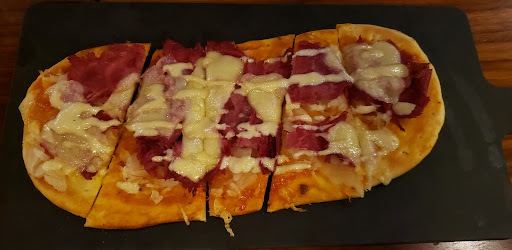 Nice ambiance inside, and service was friendly and prompt. I visited for food, but it looks like a nice comfortable place to kick back for drinks with relaxed staff. I had the fried pickles - expectedly salty but prepared well. Also, the reuben flatbread - nice amount of toppings and looked very appealing. There was something a bit off about the flavor which was different from a typical rueben sandwich, but that might have been due to the lack of rye bread. There was just the right amount of corned beef to kraut ratio, and the delicious mustard sauce was definitely the key flavor highlight. The flatbread dough itself wasn't to special, and probably is better suited to a pizza style (tomato/mozz pairing). Perhaps using a rye flatbread would have made it a total winner, but overall I was not disappointed. There were other items on the menu I wanted to try but simply didn't have the stomach space, so I will keep Denny Lodge on my list to return again...