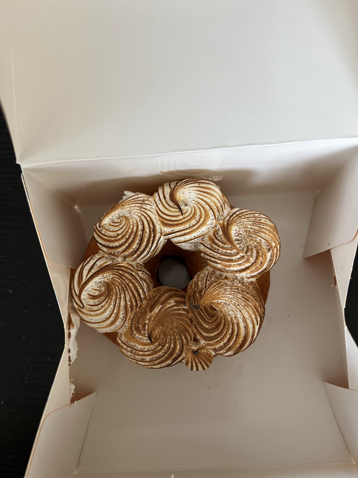 However, I think what took away from the flavor here was there was too much meringue on top Firstly, this topping makes the eating experience difficult. Trying to eat this doughnut while avoiding getting meringue on your face is a balance that shouldn’t be required - as it rises up way higher than the main part of the donut Second, because there’s just too much of it - it really dominates the flavor. This means I couldn’t really taste the tres leches flavor much at all - only at certain points. The majority of what I tasted each bite was just the meringue, which was good in fairness, but it’s pretty much just sweetness, and starts to get overwhelming by the end