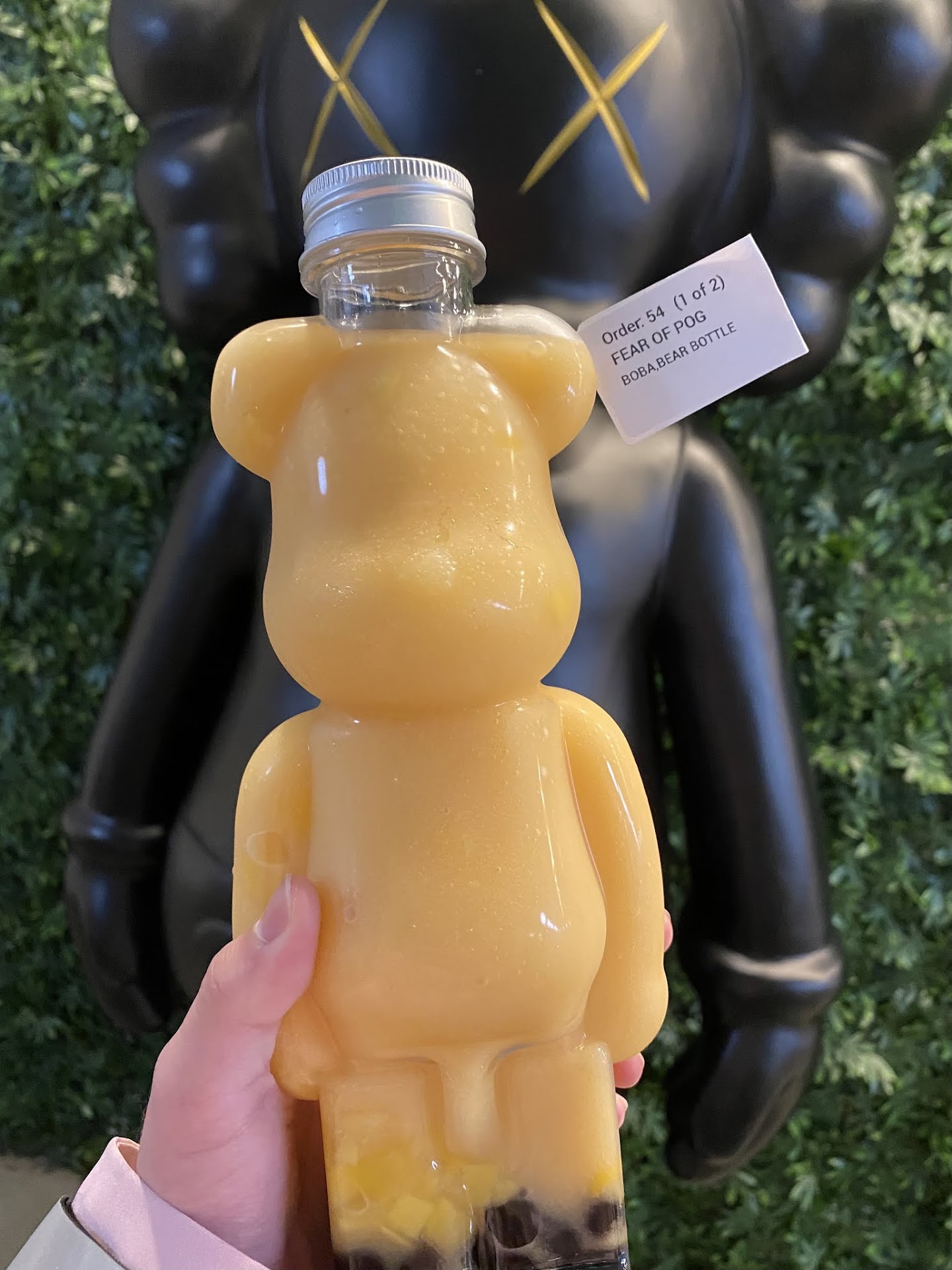 At first, when I first came here, the only reason I wanted to go here were because of the bear brick containers, and the huge KAWS statue (which they sadly took down). All of the flavors looked and even sounded so good. Another part I really like is the super creative and kind of funny names for each drink. The names are kind of like a play on words with different hype brands or celebrities. To be honest, I wasn't expecting much regarding the drinks, but man, let me tell you. The drinks are SO good. I had the FEAR OF POG on my first visit which was a passion fruit, orange, and guava slush, with fresh mango bits, and boba.