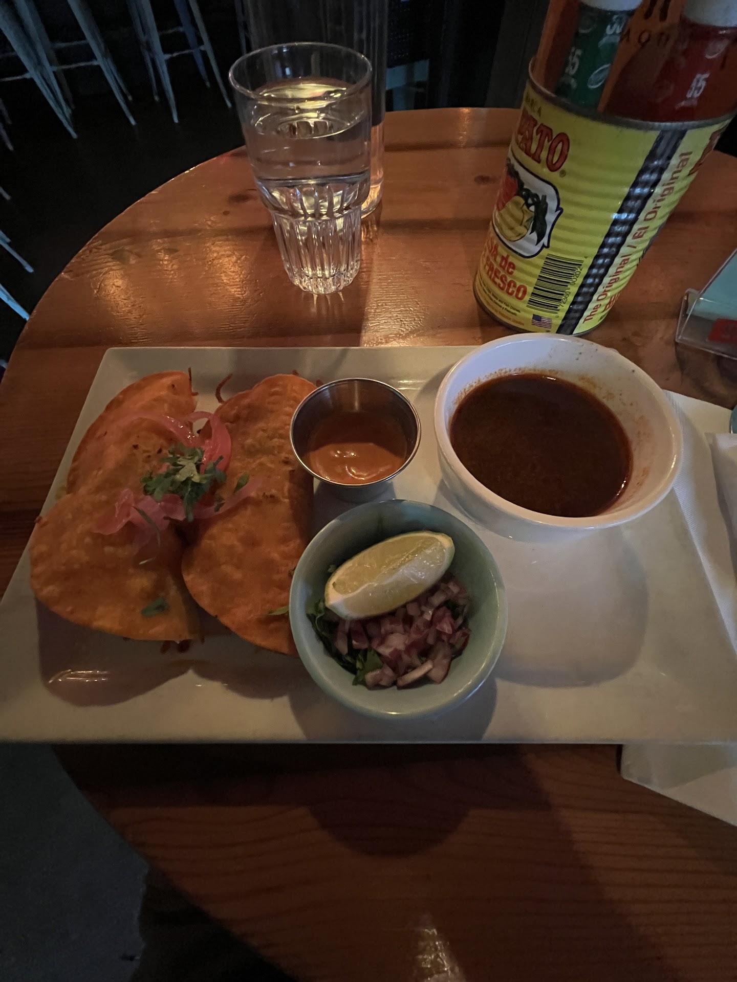 Ā Ā Ā Read moreI actually had a few things from here First, I ordered the quesabirria tacos. However, these was some of the worst food I've ever had in a restaurant. The outside of the tacos were fine, and the broth was pretty bad and flavorless, but this didn't compare to how inedible the beef was inside. It was dry, chewy, astoundingly overcooked, and practically unfit for human consumption. I could tell something was off after taking the first bite. After finishing half of my first taco, and truly giving it a fair shot, I was completely done. These tacos were just non-consumable. I waited around 10-15 minutes for the waitress to walk by and informed her that the beef was quite bad. I essentially never send things back - I don't think I have in over a year - but this was just that bad