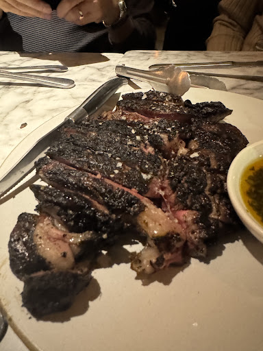 Highlights of the Meal: • Salmon Tartine – The smoked king salmon, paired with garlic aioli and pickled fennel, was a perfect balance of richness and brightness. • Winter Citrus – A refreshing and vibrant dish featuring Castelvetrano olives, shallots, and pistachios, providing an unexpected yet delightful contrast. • Roasted Leeks – The mojo picante and dill vinaigrette elevated this simple vegetable to new heights. • Lasagna – Possibly one of the best renditions of lasagna ever, with layers of smoked beef rib, pomodoro, lemon ricotta, and parmesan, all baked to perfection. • Steak – The dry-aged prime hanger steak, kissed by the open flame, was cooked masterfully, served with Swiss chard, chorizo, and a rich jus that tied everything together beautifully. • Roasted Apple – A comforting yet elevated dessert, with caramelized apple, cinnamon ricotta, and a perfect balance of sweetness and warmth.