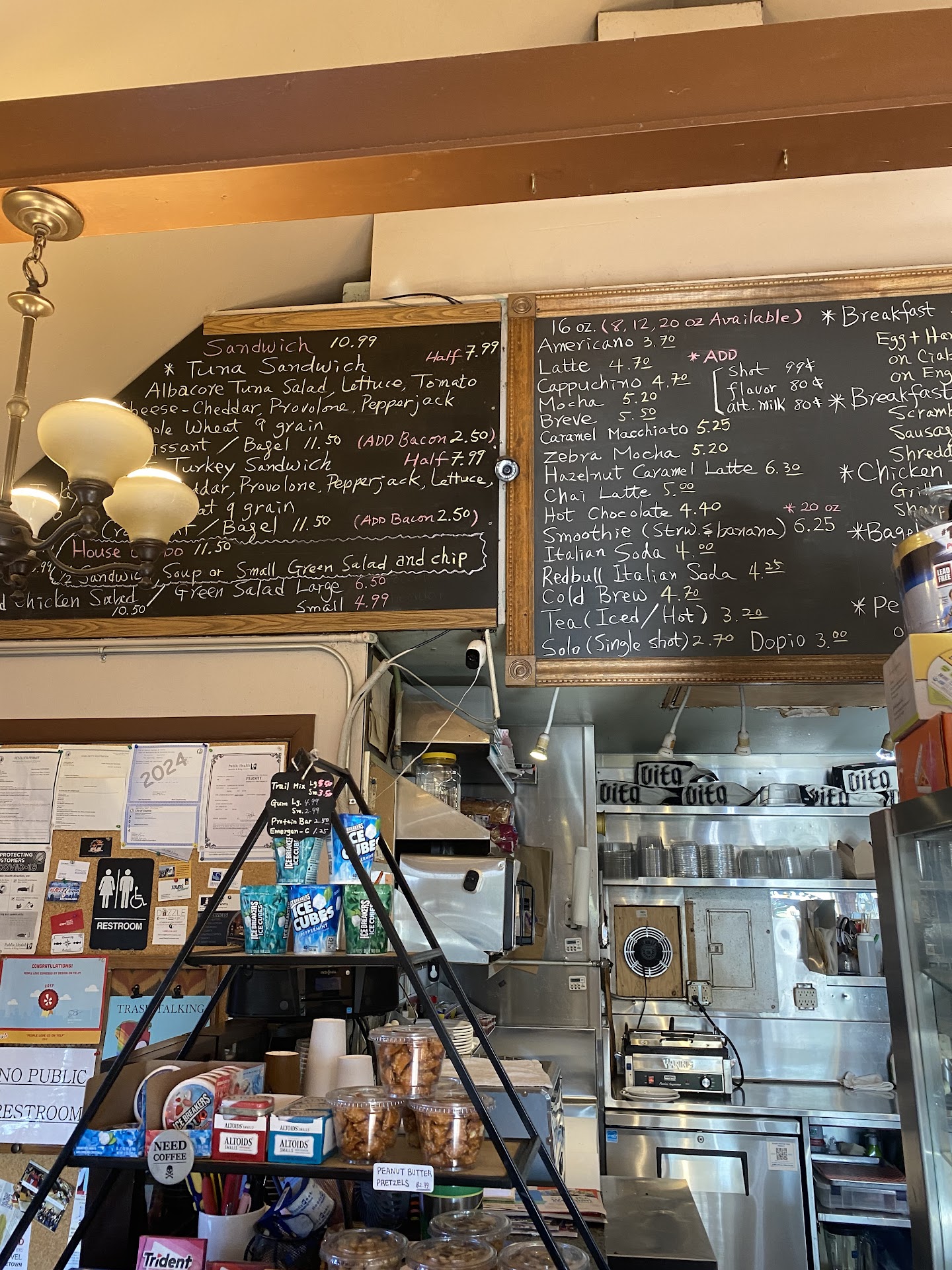 Americano was nice and strong. Lots of options for a light breakfast or lunch, snacks, lots of options for different drinks and candies.